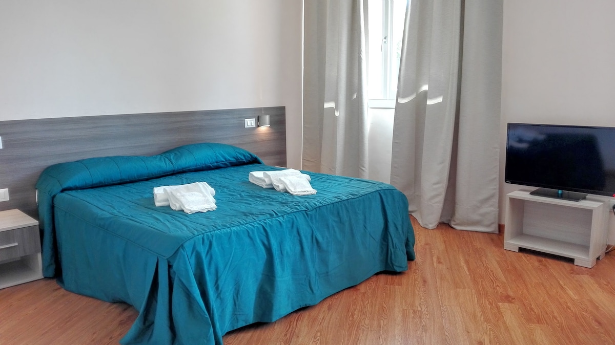 Spacious double room with a 180 cm long double sofa bed, equipped with hot / cold air conditioning, flat-screen TV, free Wi-Fi and minibar. In the room there is a private bathroom where you can find everything you need: shampoo, soap, hair dryer, toilet paper and small, medium and large towels. There are no cradles or changing tables for babies in the structure. The breakfast room is available to guests at any time, and it is also possible to have breakfast in the garden.