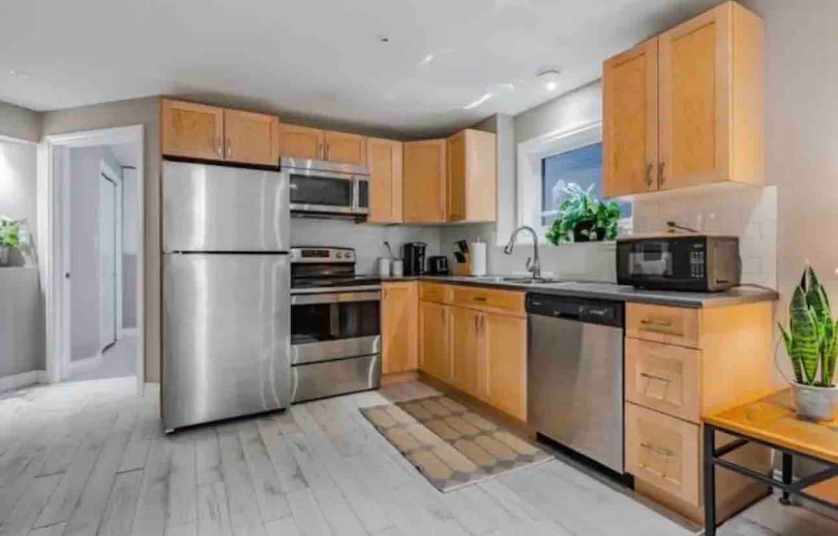 Our suite is in a great location on a quiet street (Free off street parking ) ,Free wifi , 55” TV with Roku, Full kitchen ready to go, even a dishwasher!