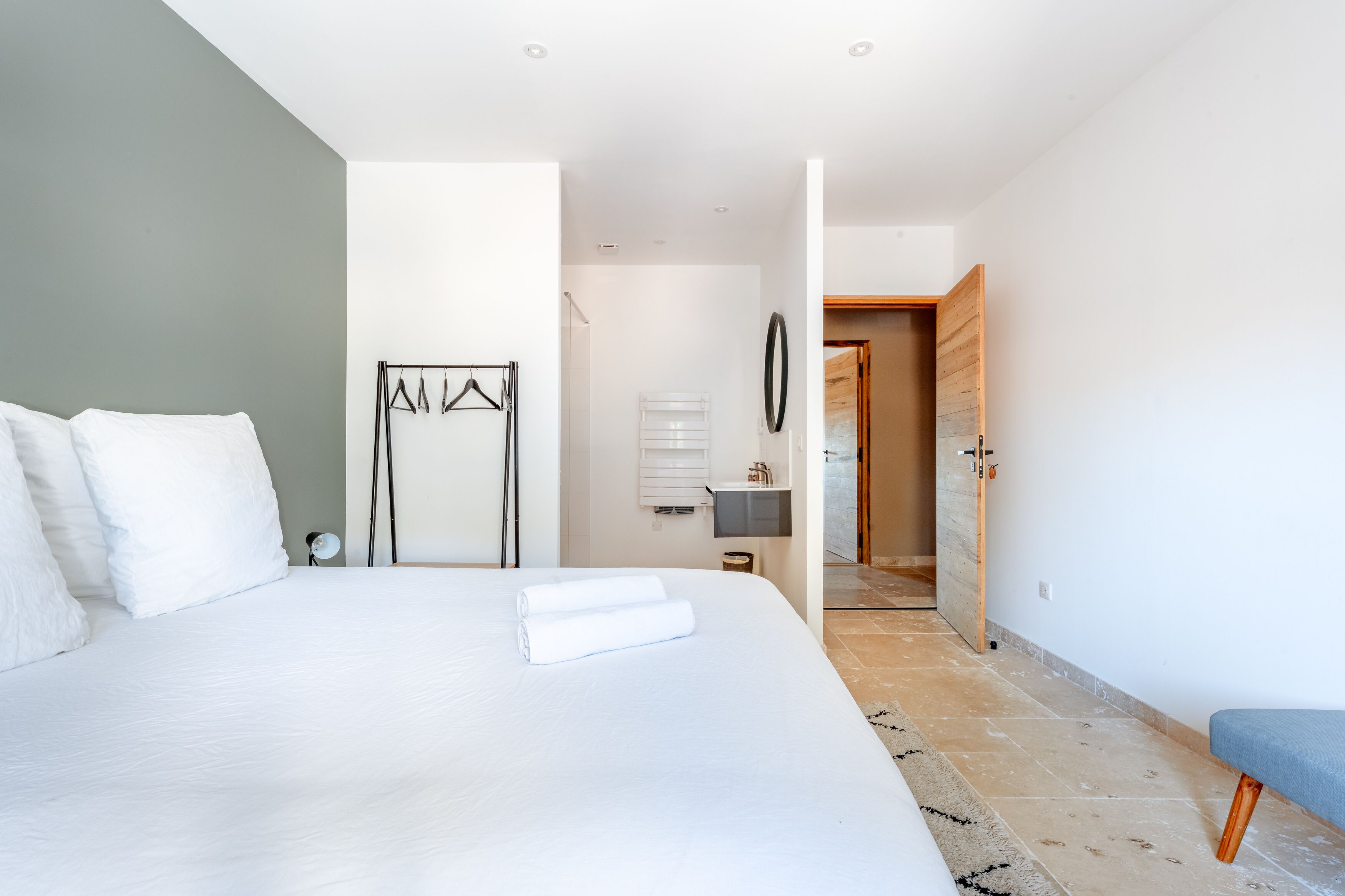 The room measures 20 m2 in total. It is equipped with a 140 x 200 bed (sheets and towels provided), a wardrobe, a shower room and a toilet. Breakfast is included in the nightly rate and is served every morning on the terrace. A coffee maker and a kettle are also available in the room. Although there is no kitchen area, many shops and restaurants in the village will welcome you with pleasure (Provençal, Vietnamese cuisine, creperie, takeaway pizzas).