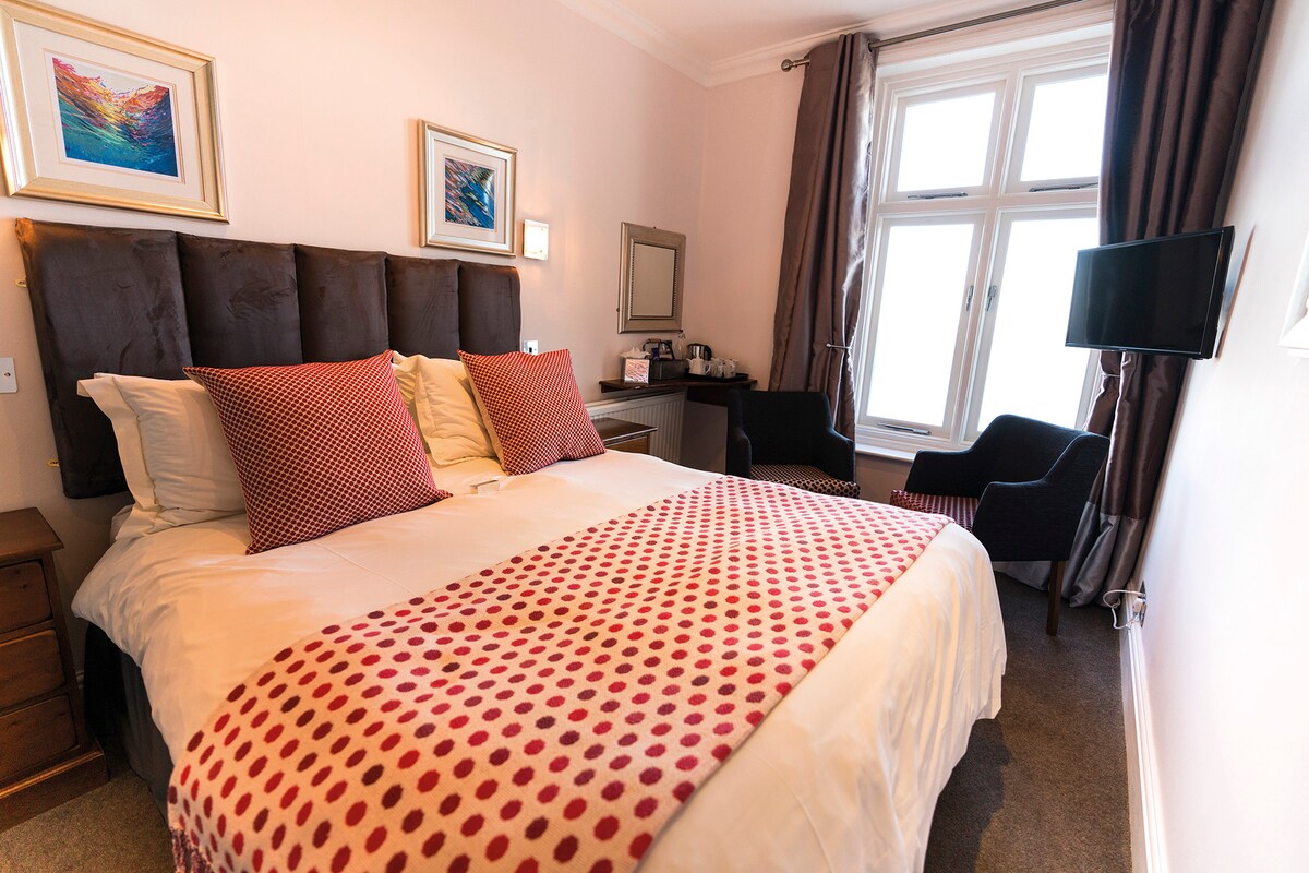 Stunning Sea Views. Modern, stylish double room with high quality en-suite facilities. 32" Digital Smart TV, 1000 pocket kingsize bed (5 foot wide) bath robes, luxury toiletries, complementary tea and coffee tray including filter coffee, tea, fruit teas, hot chocolate and biscuits. Dimensions 2.4m x 4.2m excluding bathroom.