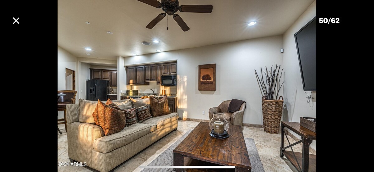 Experience luxury in Scottsdale with a private one-bedroom casita. Enjoy a spacious living room with a large TV, full kitchen, dining nook, oversized primary bedroom with walk-in closet, and private entrance through a open air patio with Arizona skys and the most majestic sunsets. Just minutes from world-class golf at Troon Golf Vlub and private golf courses like PXG. Exquisite dining, nightlife, and family fun in Cave Creek. Come be our guest!