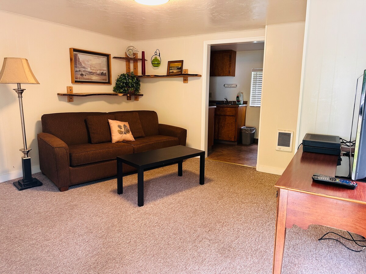 Room #3 is a one bedroom apartment, located on the main floor, has a king bed, and one hideaway sofa-bed in the living room. Is equipped with a full kitchen, a full bath and closet, TV-cable, and Wi Fi.