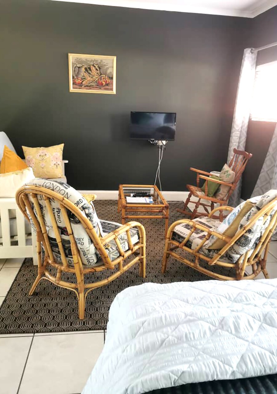 The self catering Strelitzia Suite is perfect for couples or young families. A curtain divider ensures the privacy of your king size bed (or twin bed) from the sleeper couch for the young one. The fully equipped kitchen and outside gas barbecue allows you to prepare your own meals at your own leisure. The desk and complimentary wifi keeps you connected, while you disconnect, The private bathroom includes a shower with a gas geyser. Your smart TV is equipped with Netflix.