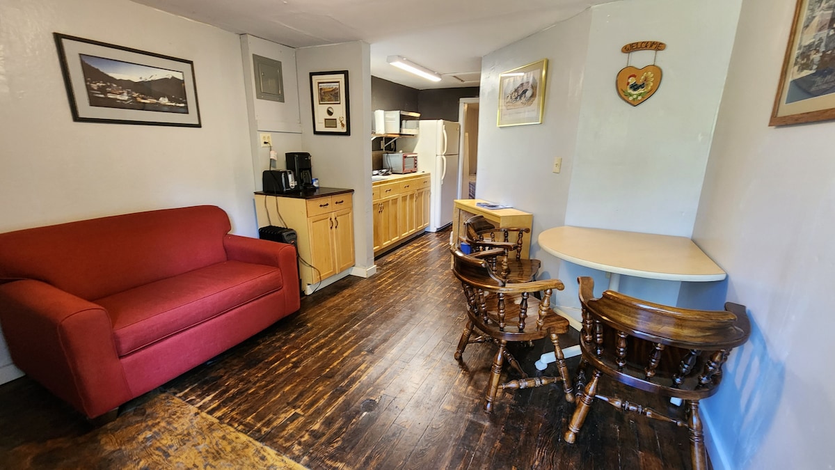 There is a lockbox with a key. You will receive the lockbox code on the day of arrival. Once you enter the guesthouse, there is immediately a sofa, coffee table, TV, and chair in the living area. There is also a bistro table for four to dine. The sofa is a full-size, pull-out couch that sleeps two. There are instructions on the wall for how to make it into a bed. The TV uses Roku to allow guests to use their favorite streaming apps. The kitchen is to the left. There is a propane stove and oven for cooking and a refrigerator/freezer. There are other appliances such as a blender and toaster. Coffee is provided.