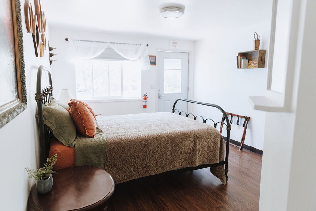 Located just inside the shared exterior North door and next to the common kitchen. This first level room has a sitting area, private bathroom, table and chairs, TV, mini-fridge and Sofa. The sofa pulls out for additional sleeping. Attached by a sliding glass barn door is the bedroom with a queen size bed, closet and small desk. The west room sleeps 2-4 guests but is most comfortable for couples and families traveling with children. Breakfast is included and is help yourself style.