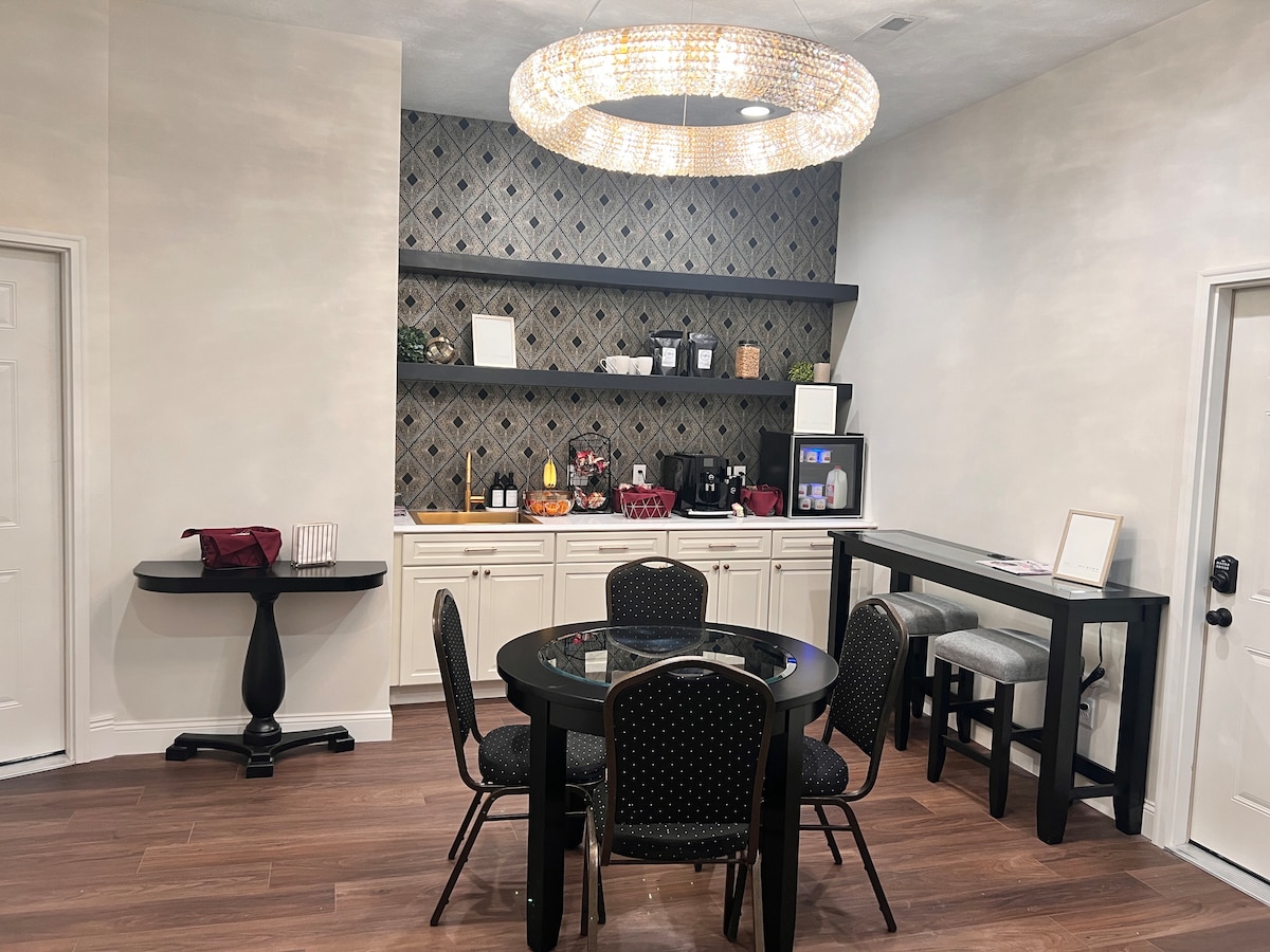 The Aria features a sleek black and grey décor. A king size bed, large smart TV, oversized chair, and a table and chair set. The suite has a kitchenette including a refrigerator and microwave. The kitchen is stocked with Kate Spade Lenox Dishes, silverware, and utensils for light cooking! Each stay includes our favorite coffee from the North, Caribou Coffee with your own Keurig coffee maker, an assortment of tea’s, snacks, bottle of water, popcorn and Lindt Chocolate! The bathroom has a shower comes fully stocked with linens, soap, shampoo and conditioner, and hair dryer.