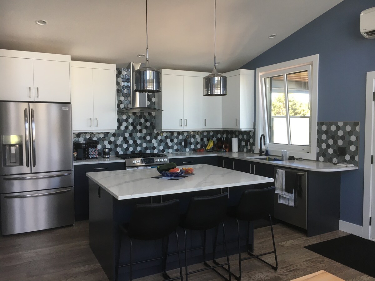 The Primary bedroom features a King sized bed, dresser, spacious walk in closet, ceiling fan, vaulted ceiling and 3 tall east facing windows. The secondary bedroom has a Queen sized futon mattress bed, dresser, closet, and a workstation with a desk, chair and lamp for a private place to study or work. In the hall is a linen closet and access to the bathroom with a walk in shower and in floor heating. The open concept living, dining and kitchen area has a vaulted ceiling and boasts beautiful greenery views to the East and Ocean view of the Sooke Ocean Basin and Sooke Foothills to the North! This full size kitchen includes a pantry, fridge, freezer, microwave, gas range, gas oven, and a large spacious island. Enjoy eating at the sofa table (up to 3 people) or at the island (also set up for 3 people) or when wether permits, in the outside patio area (up to 6 people at the outside dining table). Relax on the comfortable sectional (which can pull out to a queen sized bed), and enjoy the fireplace, free WiFi, and cable/Smart TV service. The suite is temperature controlled via a heat pump (so cool in the summer and warm in the winter) with supplemental baseboard heat in the bedrooms. Tilt & turn european style windows allows you to control fresh airflow.