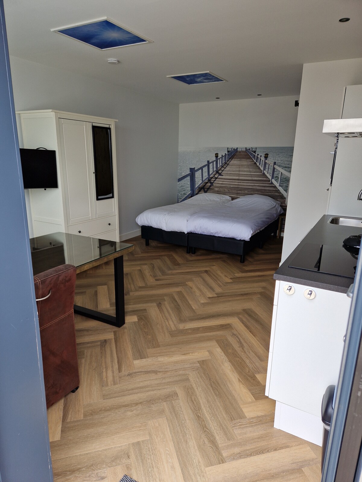 it is a room of 24m2 on the ground floor with kitchen/shower/toilet/table with 4 chairs and 2 beds and spacious outdoor grounds with parking in front of the door.