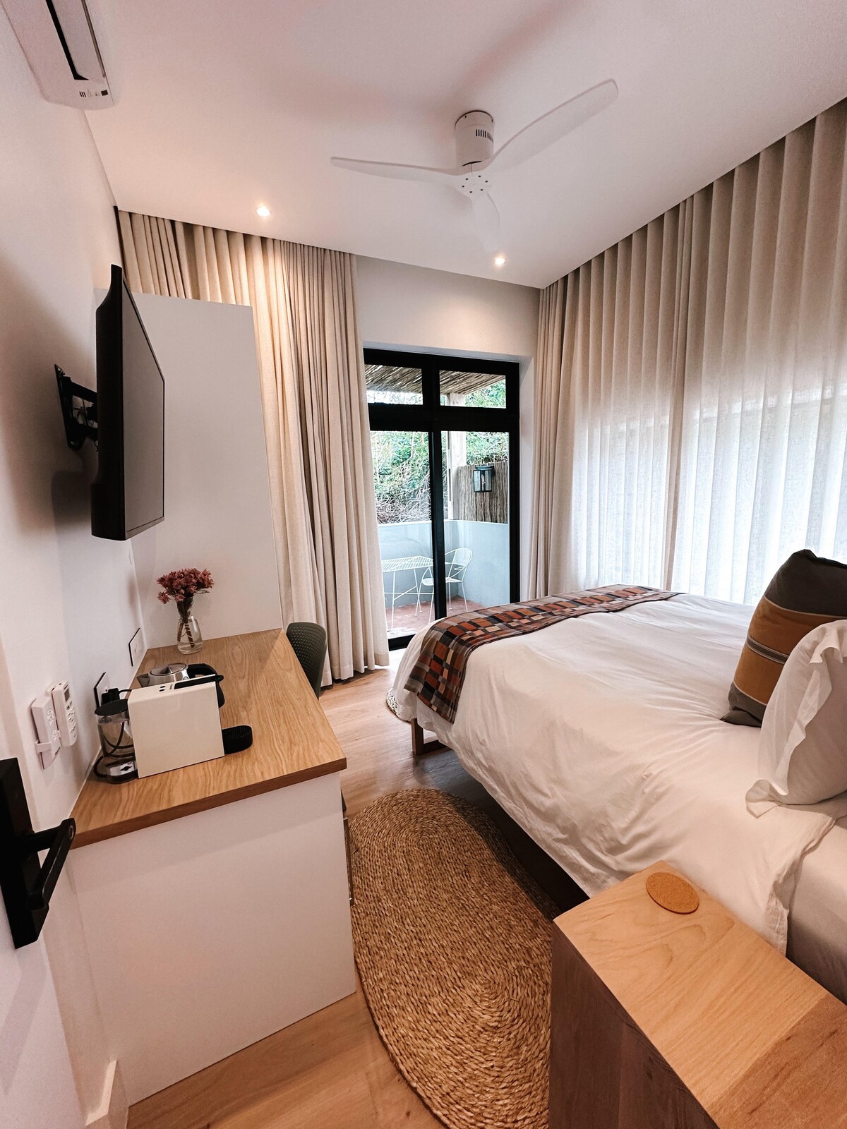 This charming room features a super king-size bed that can easily be converted into two singles, making it perfect for solo travelers or companions. The soft vintage décor creates a romantic and serene atmosphere. Step out onto your private veranda and enjoy views of the beautifully maintained gardens that gracefully surround the guesthouse.