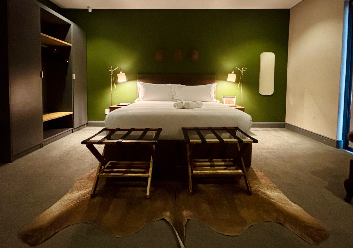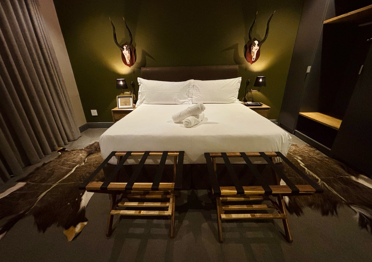 Indulge in the romantic allure of our guesthouse room inspired by the free-spirited elegance of Denys Finch Hatton from "Out of Africa." Adorned with safari accessories, and classic literature, the room exudes a sense of worldly charm and refined taste. Rich mahogany furnishings, plush leather seating, and soft, billowing curtains create a cozy retreat that mirrors Finch Hatton's love for adventure and sophistication. Envision the golden age of safari as you unwind in this space.