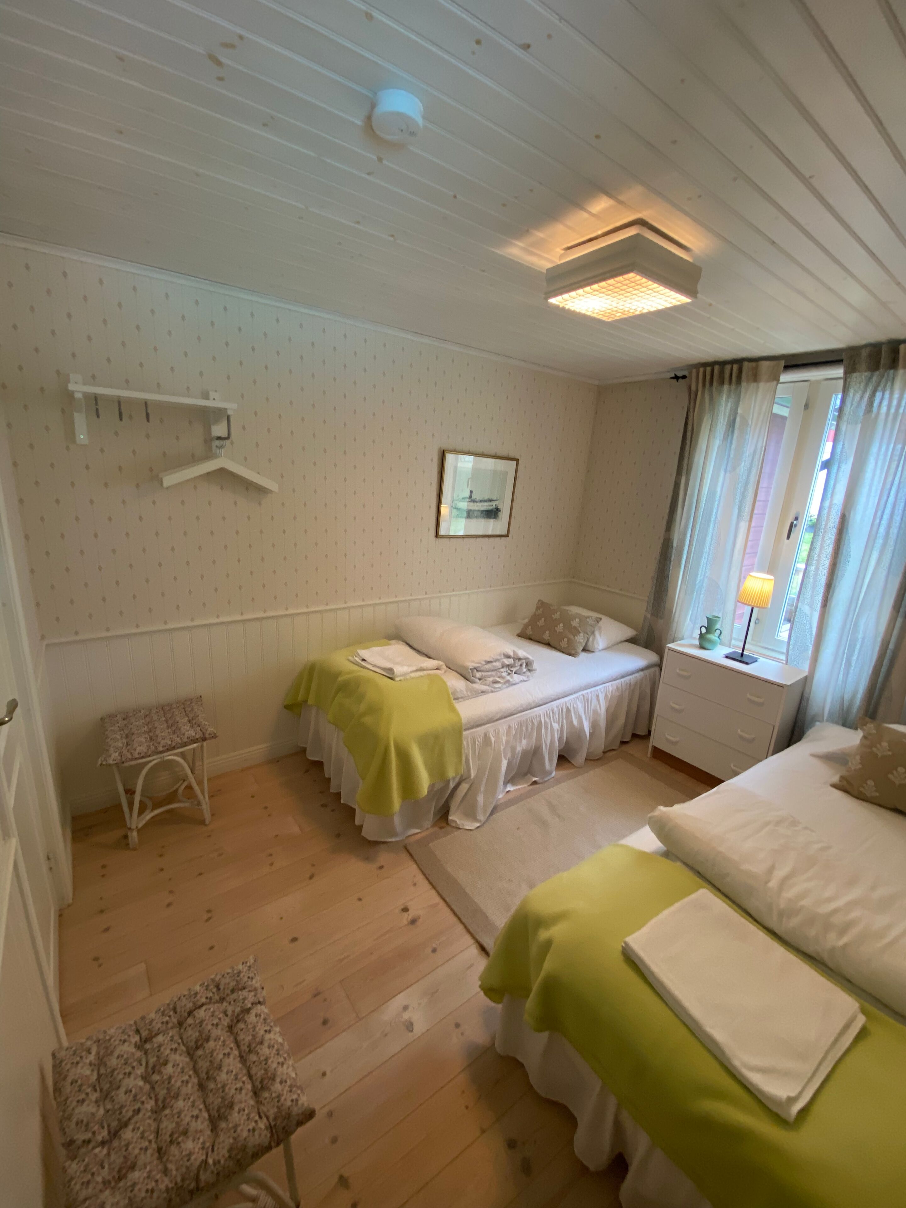 This rental includes two separate houses. The main guest house has two bedrooms with a total of four beds, kitchen and bathroom, and the cottage on the water has a single room with one queen size double bed. One of the bedrooms in the main guest house has a bunk bed, and the other bedroom has a two single beds put together as a double bed, but can be separated at your convenience. The cottage down by the water (about 100 m from the main guest house) is heated but has no running water.