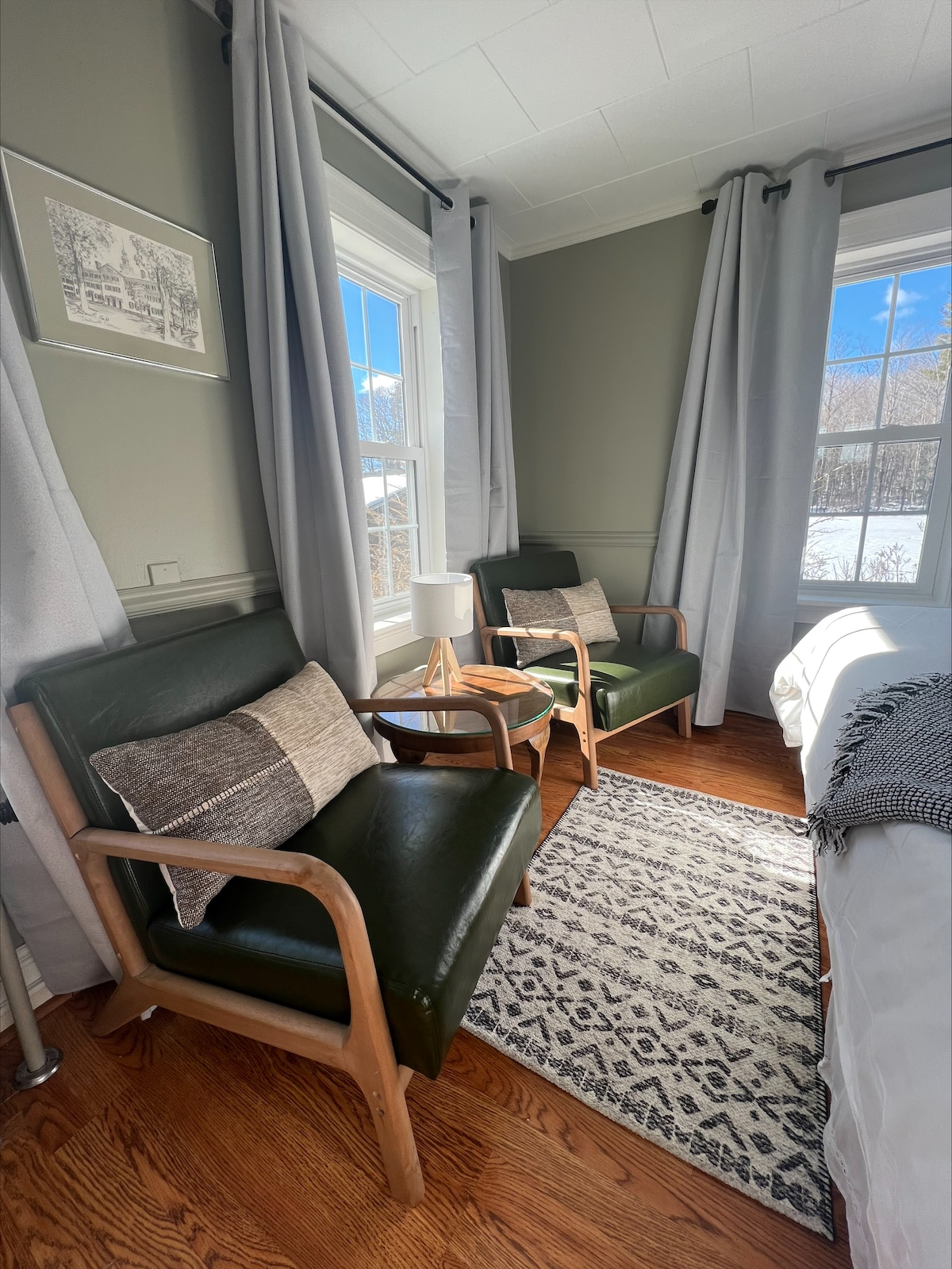Room # 14 combines historic charm with modern comfort. Enjoy a cozy space with a private bath and take advantage of our inviting tavern room with a fireplace as well as a library. Spend your days exploring nearby hiking, skiing, and lake activities, then unwind by the fire or stroll our scenic trails. Dexter’s Inn is perfect for couples, families, and groups seeking a memorable New England retreat. One Queen Bed, One twin, One full bath. Dog friendly with additional fee!