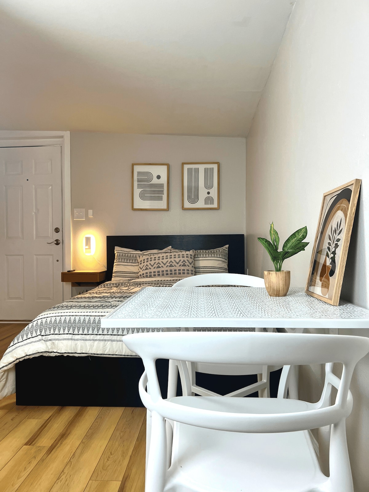 Step into a stylish studio, equipped with a memory foam mattress, 40" Smart TV, and a modern kitchen. You'll be sure to have a great nights sleep before cheering on your favorite team.