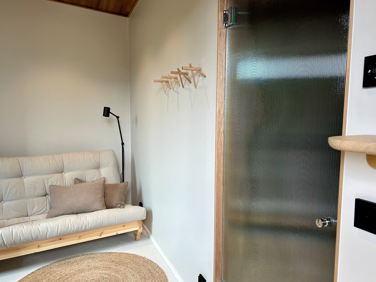 The private courtyard building has a small cabin with a sofa bed with a comfortable mattress (140 cm). The accommodation has a separate toilet and bathroom with two showers and a spacious sauna, which you can freely use and heats easily with an electric stove.