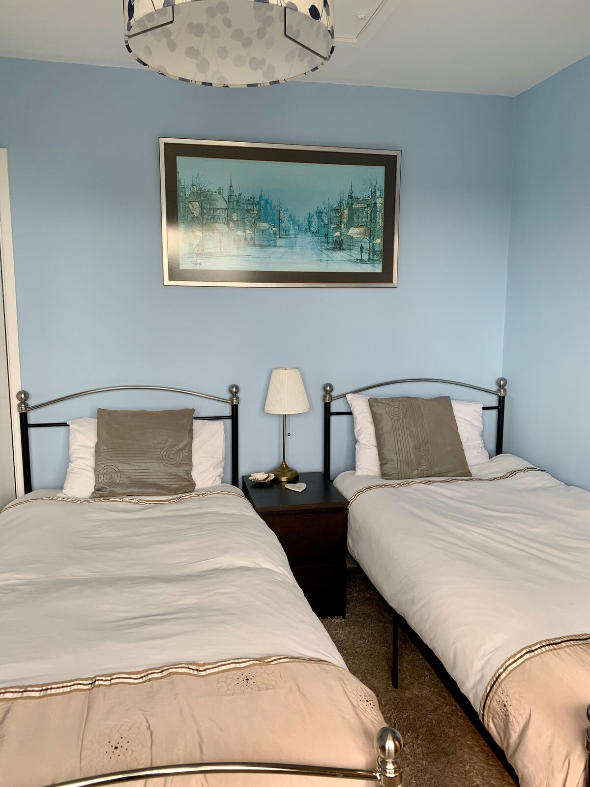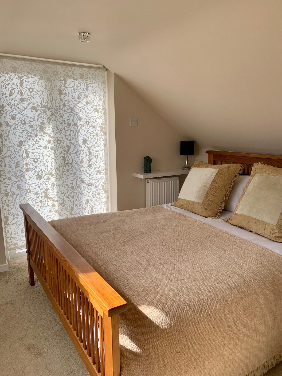 Pretty twin bedded room with it’s own private bathroom in our very peaceful home. A large picture window gives you stunning views and it soaks up the sun all day.