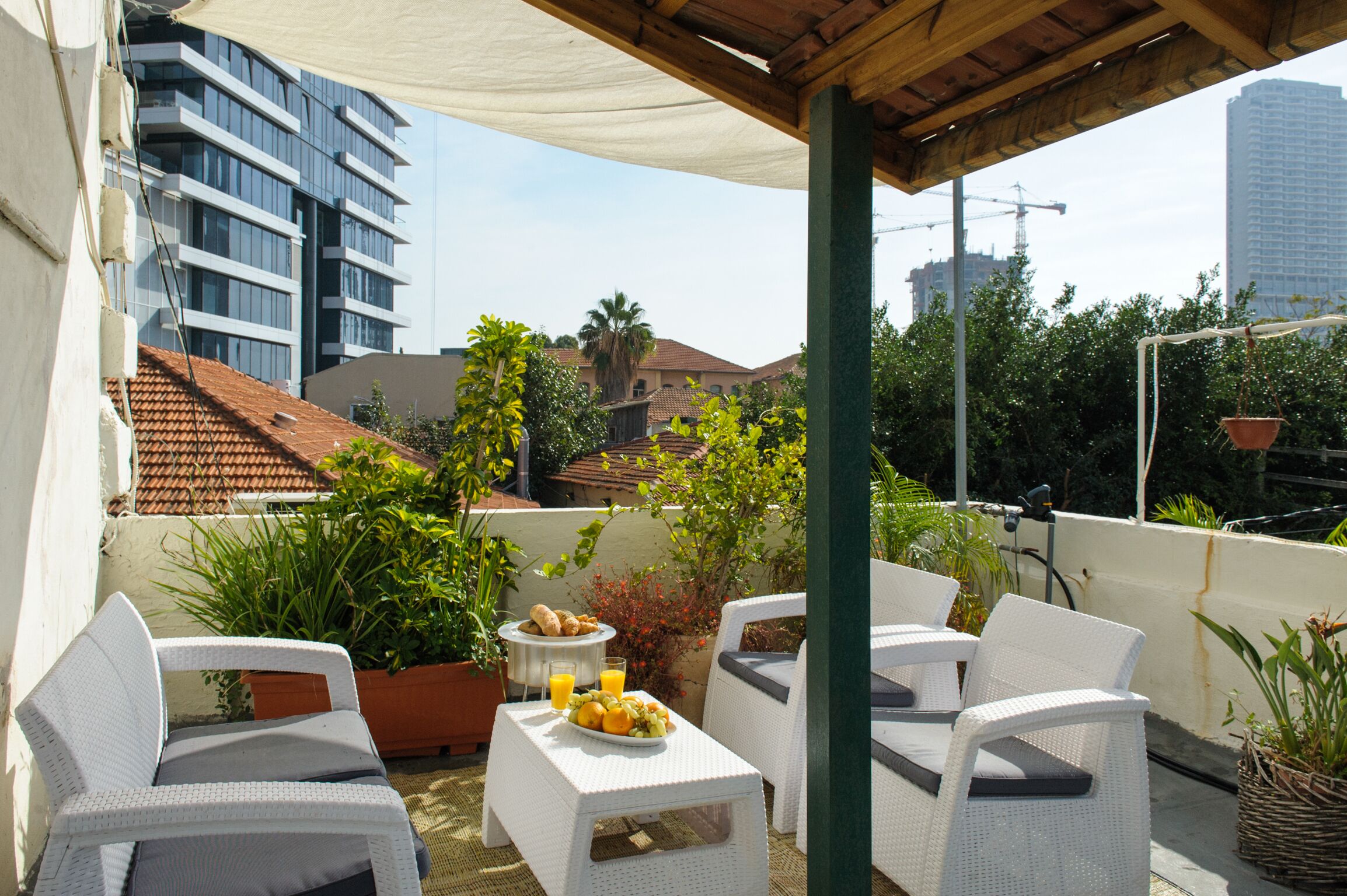 Spacious Vacation Apartment, Located on a rooftop of Historic building on Shabazi Street, literally in the Heart of Neve-Tzedek, with 80 meter square of private roof terrace, lots of view and open sky. It includes Large bedroom and even larger living room. High ceiling, original painted floor, lots of light and windows to the west, south and east. The 2 double beds allows a lot of comfort to couples who like big spaces and or families who need a lot of space.