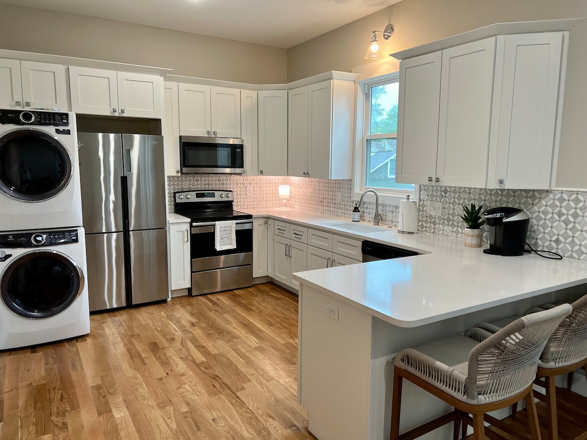 There is a full kitchen, living area with sleeper sofa couch and TV, two bedrooms each with a Queen size bed, and a full bathroom. The home is ~800 sf, with 10 ft. Ceilings, hardwood flooring throughout, and soft close cabinetry.