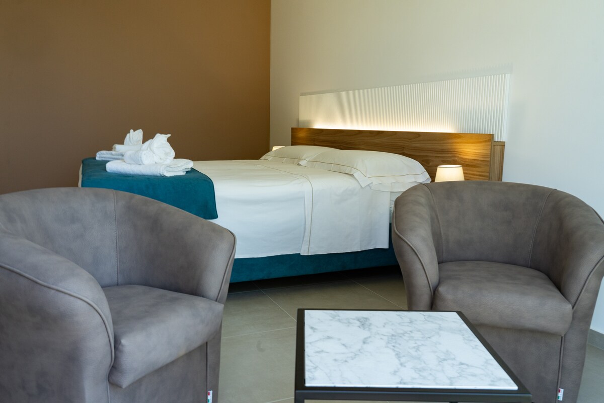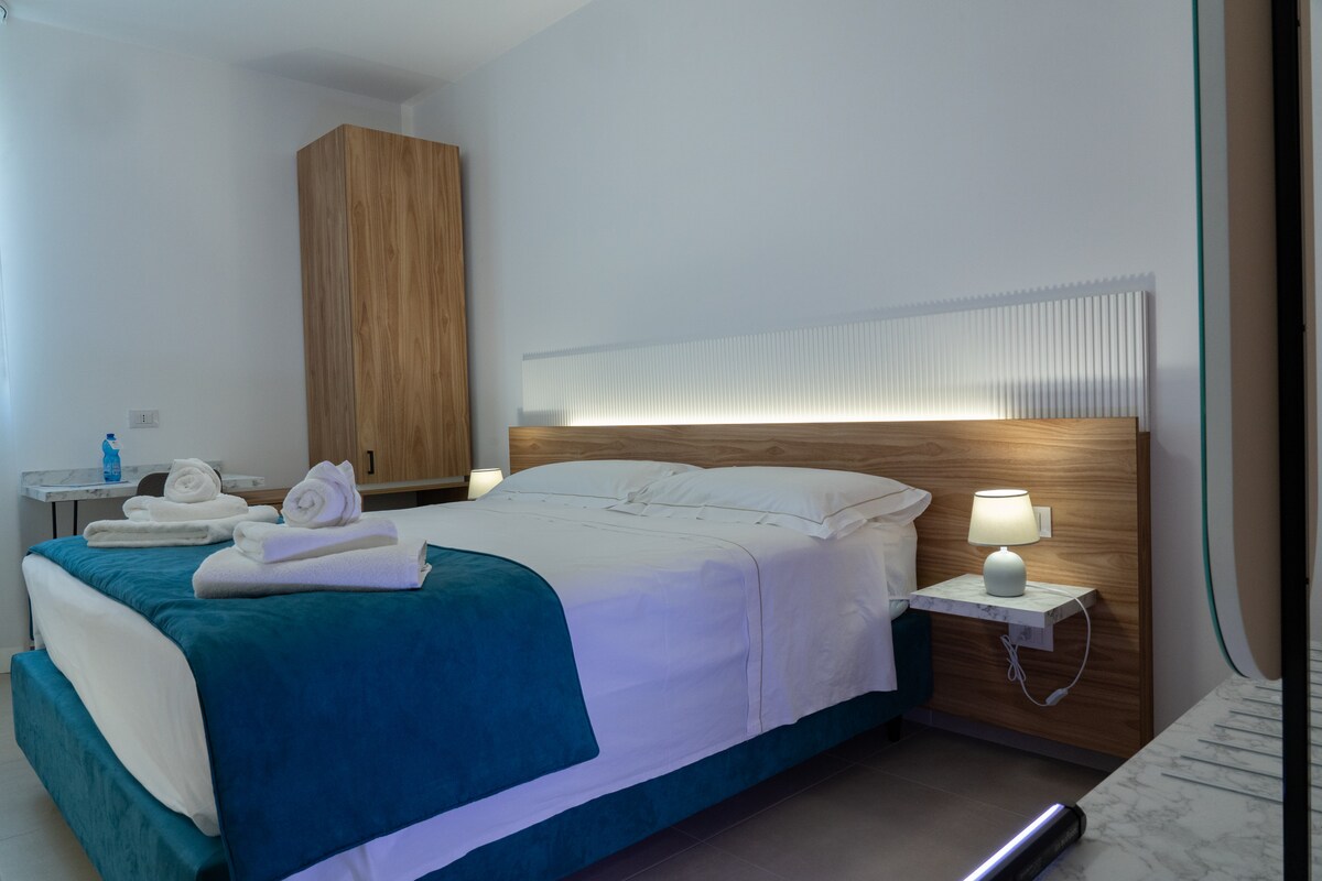 A smaller and more intimate room, but one that enjoys all the comforts like the other rooms of the B&B. Cristalli di Sale is equipped with a king-size bed with a high-quality mattress. It is furnished in soft tones dedicated to relaxation and includes a modern bathroom finished and expertly crafted with resins.