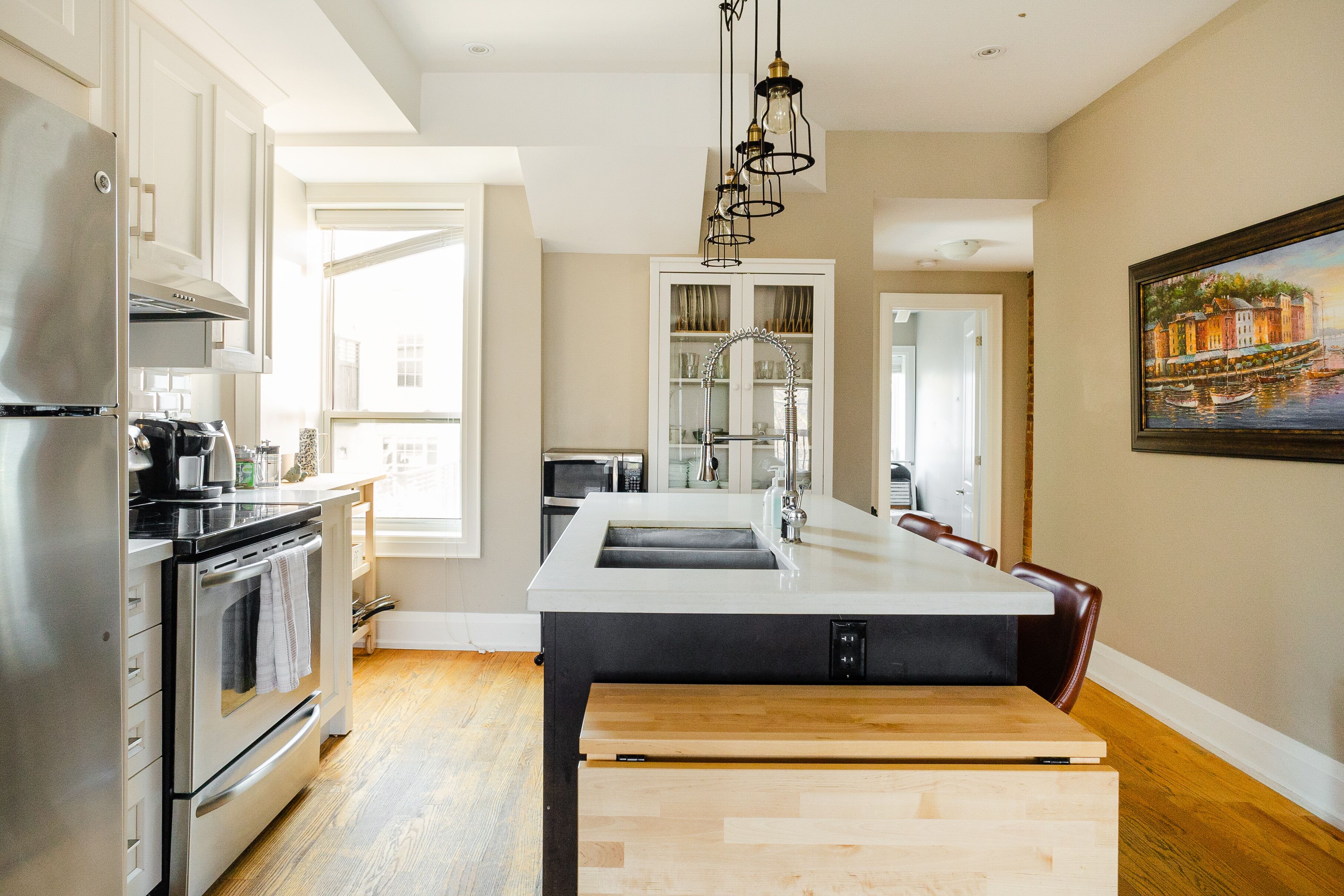 ➜ Fully equipped kitchen with appliances including fridge and stove.