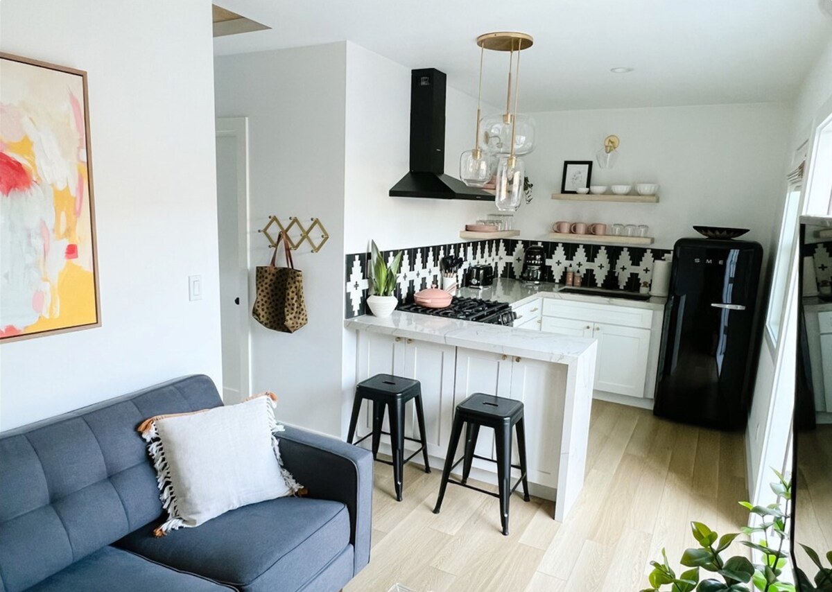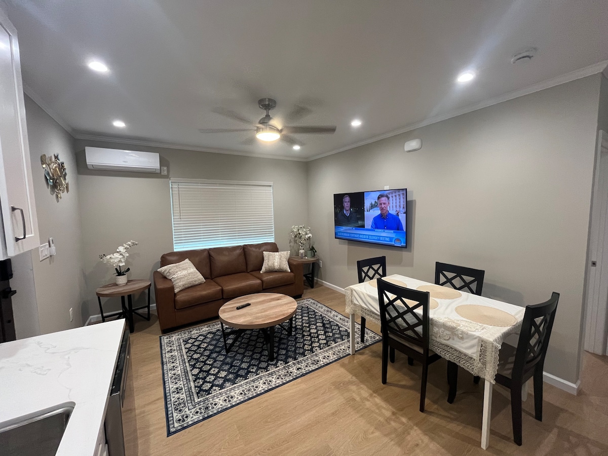 This cozy 10-foot ceiling home features an open-concept kitchen with a fridge and gas stove, a microwave, washer and dryer, a 46-inch smart TV, and AC heating and cooling split system.