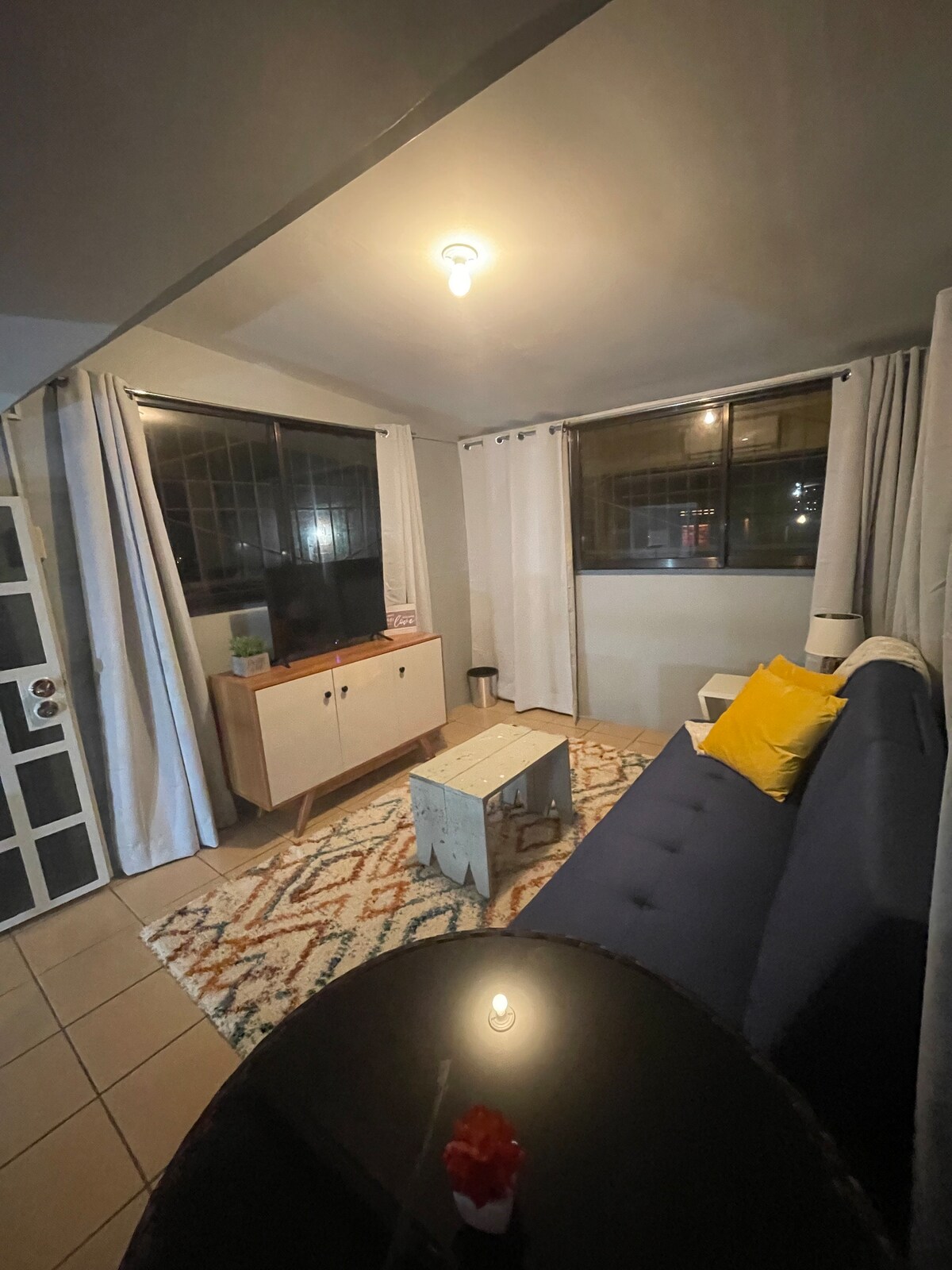 The apartment is upstairs. Guests have access to a kitchenette, living room, laundry, and a mini gym. Driving is 4 minutes (1.4 km) or 15 minutes casual walking pace to East Gate and Trincity Mall via Eastern Main Road and Trincity Central Road. The area is dynamic with easy access to 24/7 transportation.