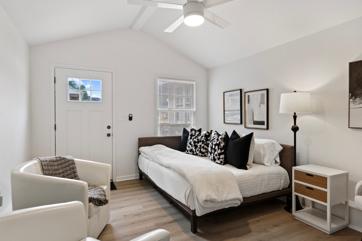 This inviting 1-bedroom, 1-bathroom guesthouse is located adjacent to the main house. Please note that guests will need to walk across the grass yard to reach the guesthouse. If you have mobility concerns, we encourage you to contact us before booking so we can ensure the property meets your accessibility needs.
