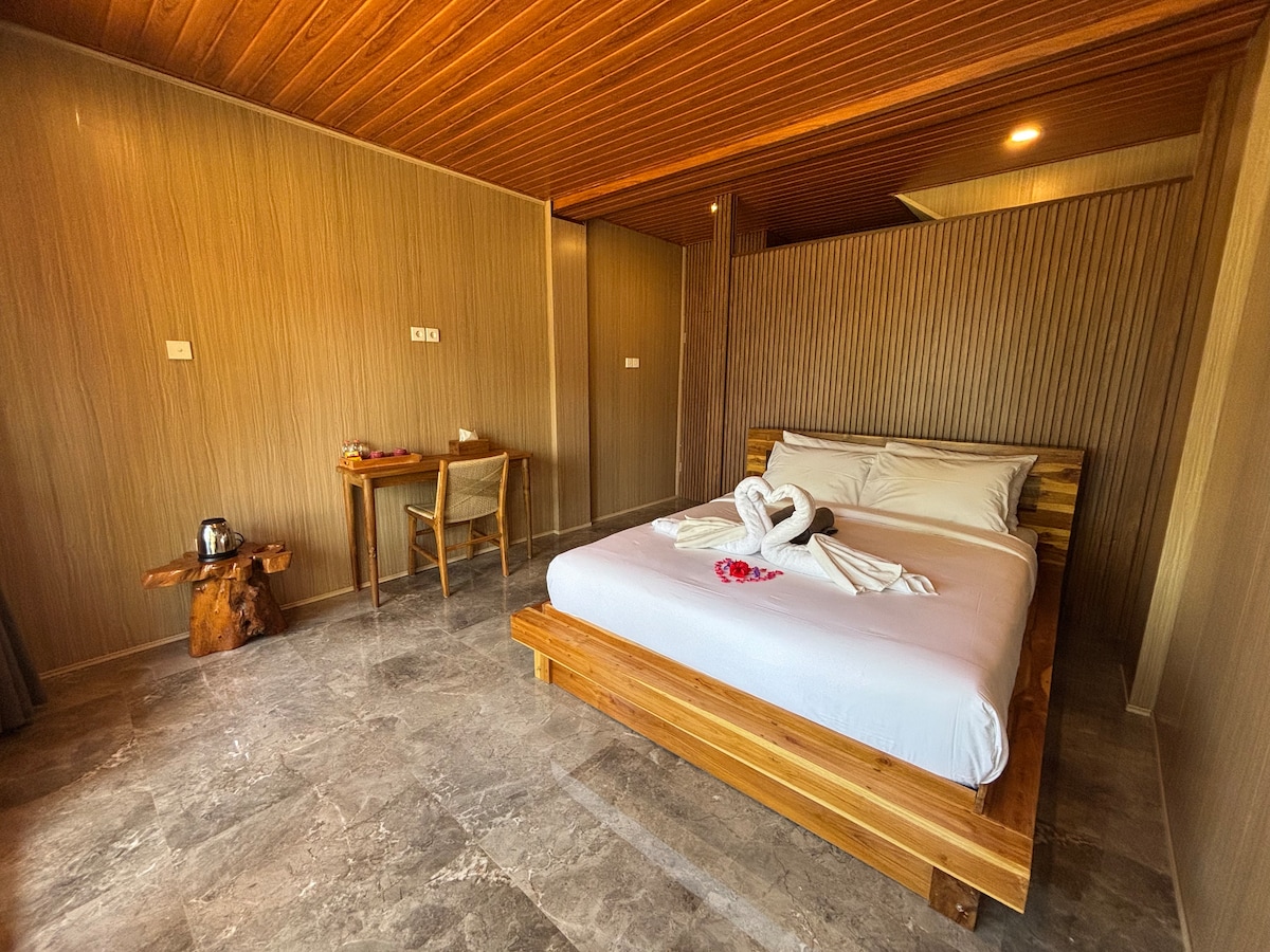 The bedroom features a comfortable bed and tasteful decor, ensuring a restful night's sleep amidst the serene environment.