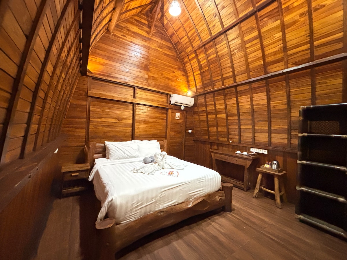 Enjoy the unique design of the Joglo house, characterized by its intricate wooden carvings and open-plan layout that harmoniously integrates with the natural surroundings.
