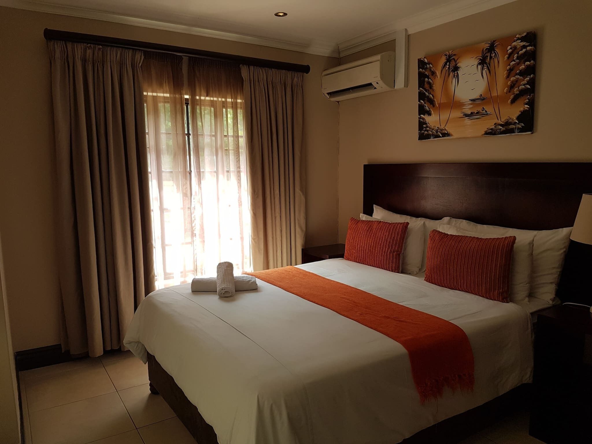 Luxury spacious en-suite bedroom with 2 extra-length single beds or extra-length king-size bed, a private lounge, opening to a balcony. Quality percale linen, DStv, DVD, air-conditioner, hospitality tray, safe, hairdryer, bathrobes, etc.