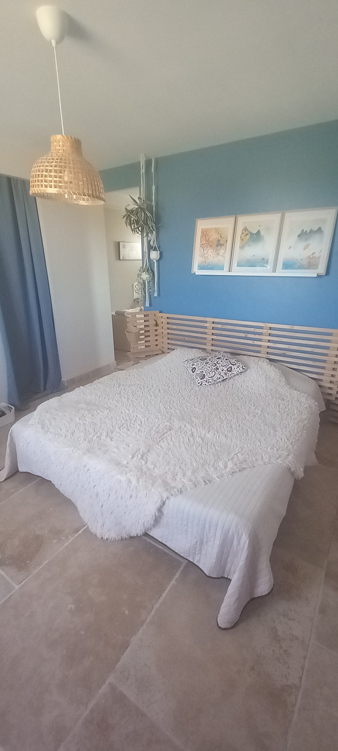 The bathroom and toilet are located in the largest bedroom. The second bedroom is equipped with 2 beds of 90 (possibility to bring them closer together).