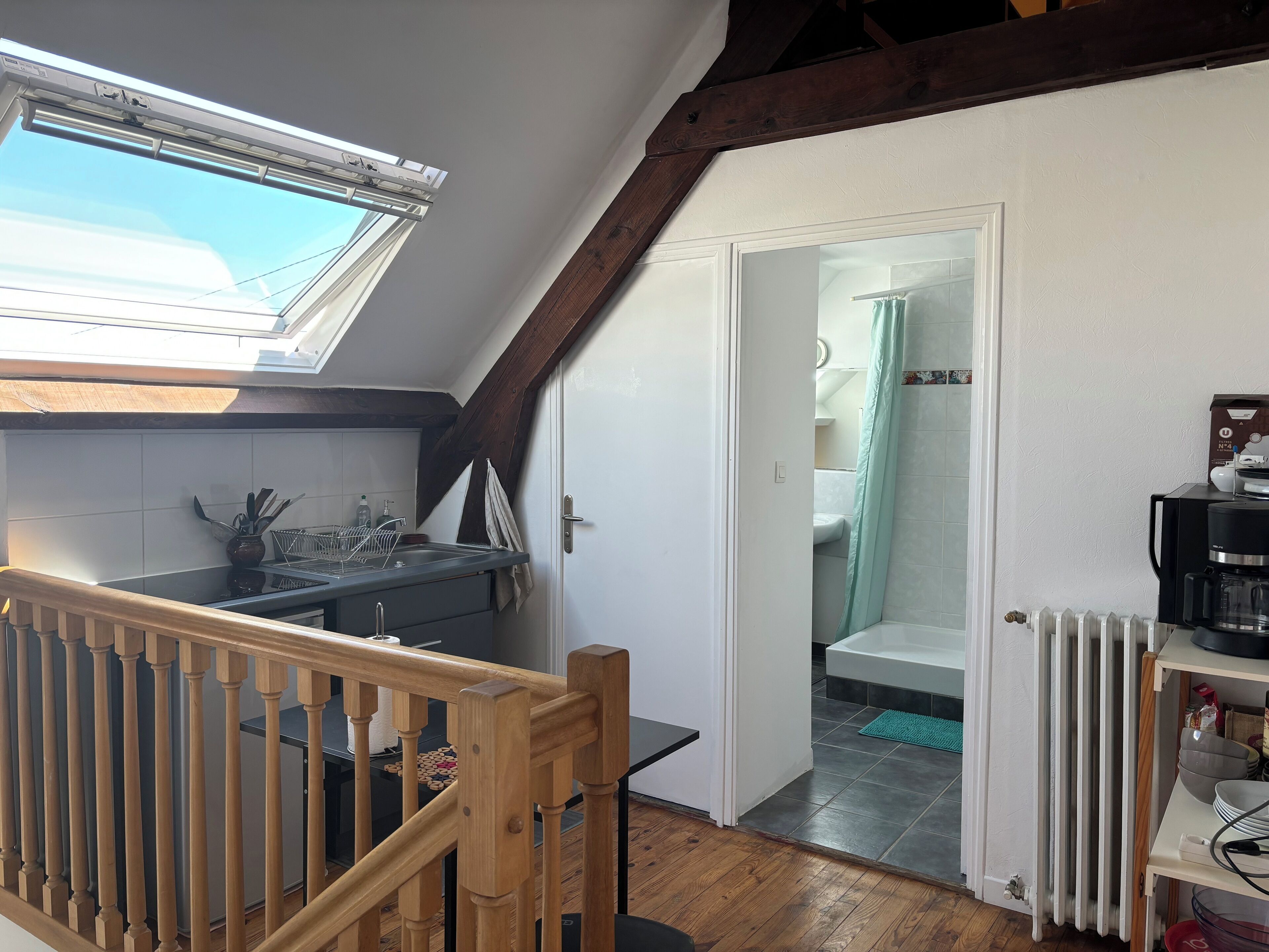 The studio is equipped with a double bed (140 cm) and a sofa bed (120 cm). It is equipped with a kitchenette, induction stove, oven, microwave and cooking utensils, TV, wifi, a private bathroom with toilet and a washing machine.