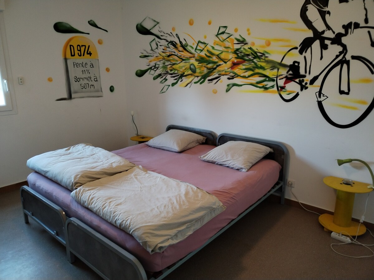 "Coeur de Pigeon" room, measuring 18m2, provides you with the comfort and warm atmosphere typical of Provence. Featuring a separate entrance, this room offers a double bed (140x190) and a single bed (90x190). Your space also includes a private bathroom with a walk-in shower, as well as separate and private toilet facilities.