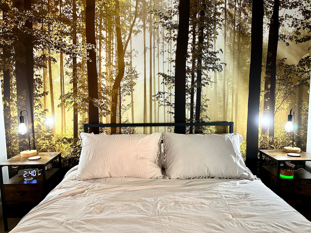 This one-bedroom suite is surprisingly spacious and full of charm. Step into the bright, modern living room, where oversized windows flood the space with natural light and 10-foot ceilings create an open, airy feel. You’ll spot stylish barn doors that cleverly conceal your coat closet—or anything else you want to tuck away—and a cozy little desk area perfect for working guests.