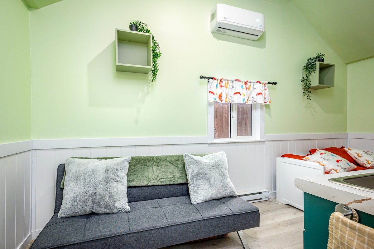 Ideal for couples or small families, the Gnome Home embodies the essence of European small-space living, encompassing comfort and convenience. Unwind on our plush queen-sized Murphy bed or the convenient fold-down futon after a day of exploring all that Vernon has to offer. The compact yet efficient kitchen area has all the essentials for preparing a light meal, while a cozy private bathroom awaits you with all the essentials for your home away from home.