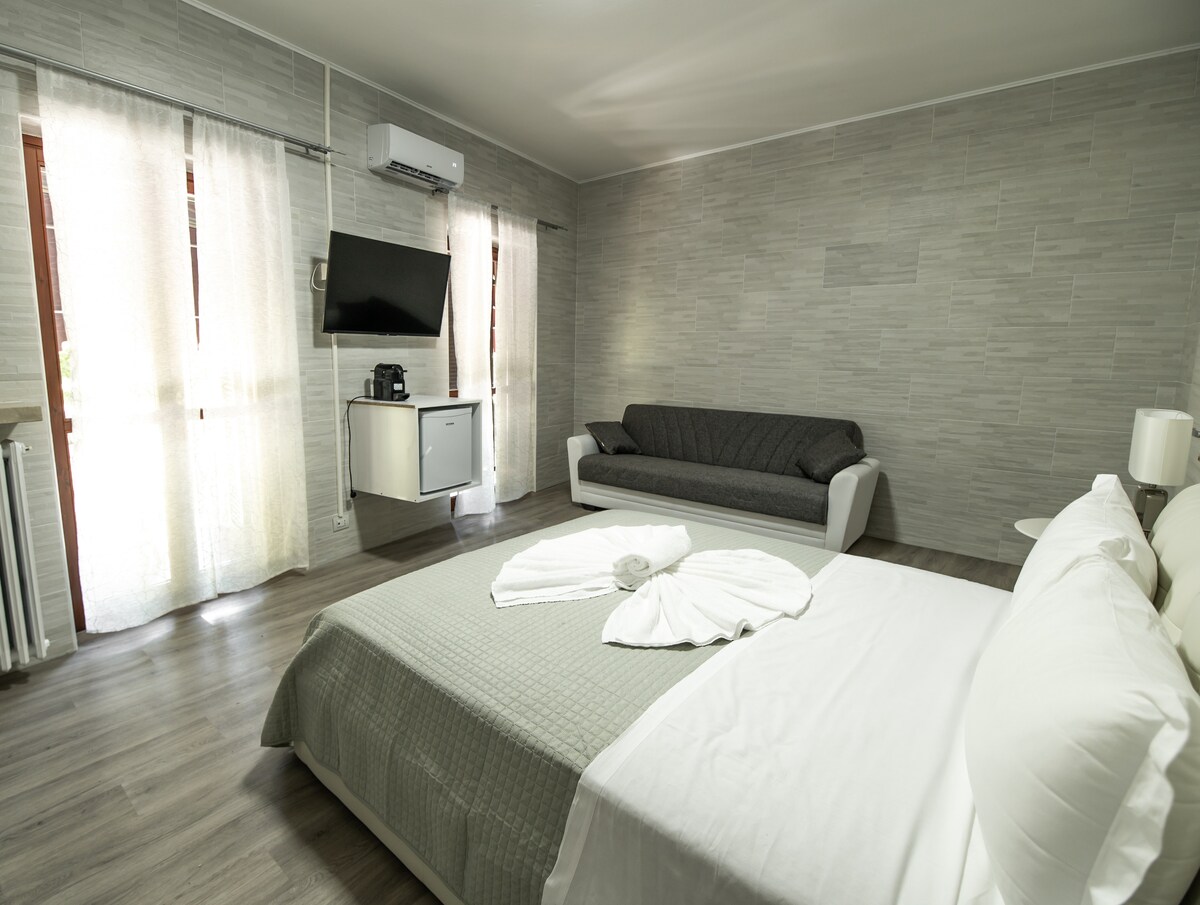 Miralago is our south-facing room, with a beautiful view of the grove and Lake Garda, it also includes a small panoramic balcony for two. Recently renovated, it is a fine room, with a spacious wardrobe, sheets and blankets, mini fridge, computer shelf, smartTV and bright window. It has an exclusive bathroom with shower, hairdryer, towels, body wash and soap. WiFi is included (about 130Mbps).