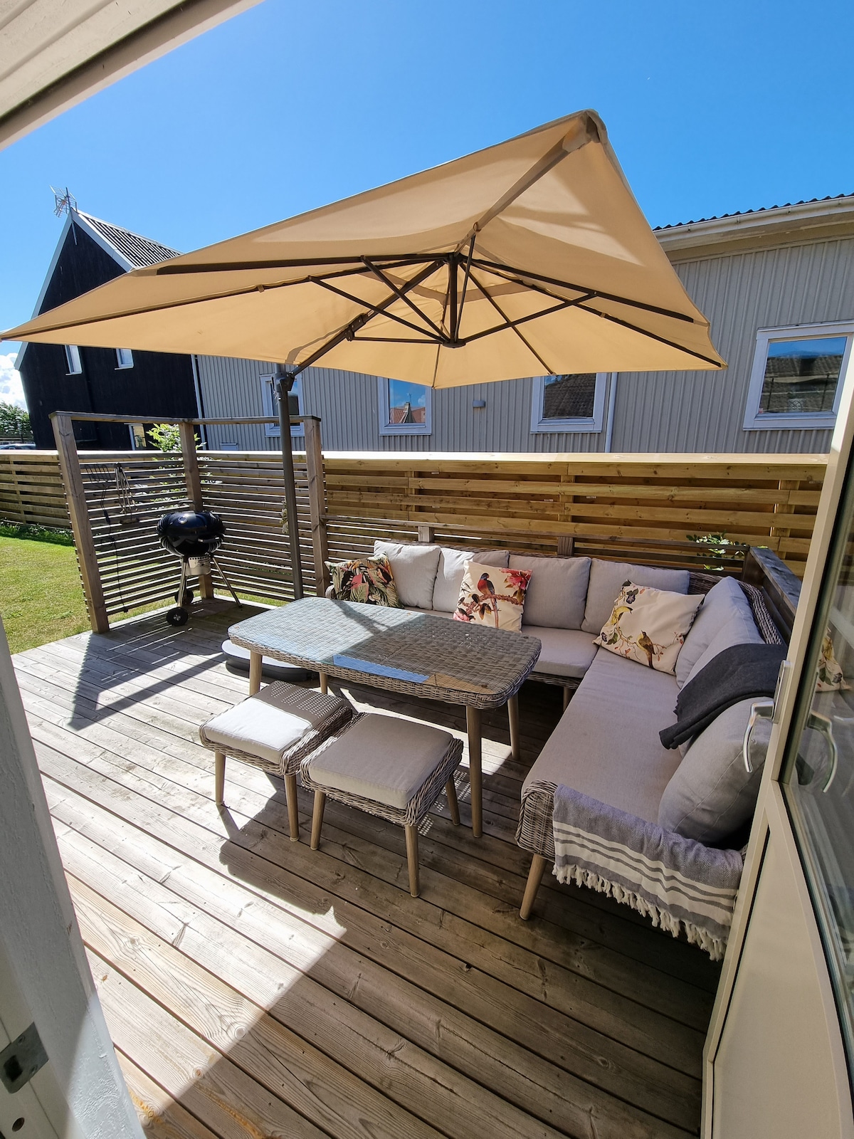 Spacious fresh accommodation in Viken with sunny terrace all day/evening. Here you are close to the beach (12min walk), the harbor (25min walk), the golf course, restaurants, grocery store & hiking trails