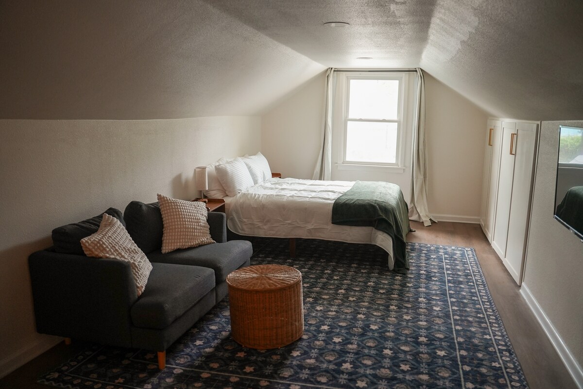 The magic doesn't stop there. A separate, quaint bedroom offers a tranquil haven with a comfortable twin bed, another cozy reading area, and a TV for your entertainment pleasures. It's the perfect spot for solitude or for younger guests to have a space of their own.