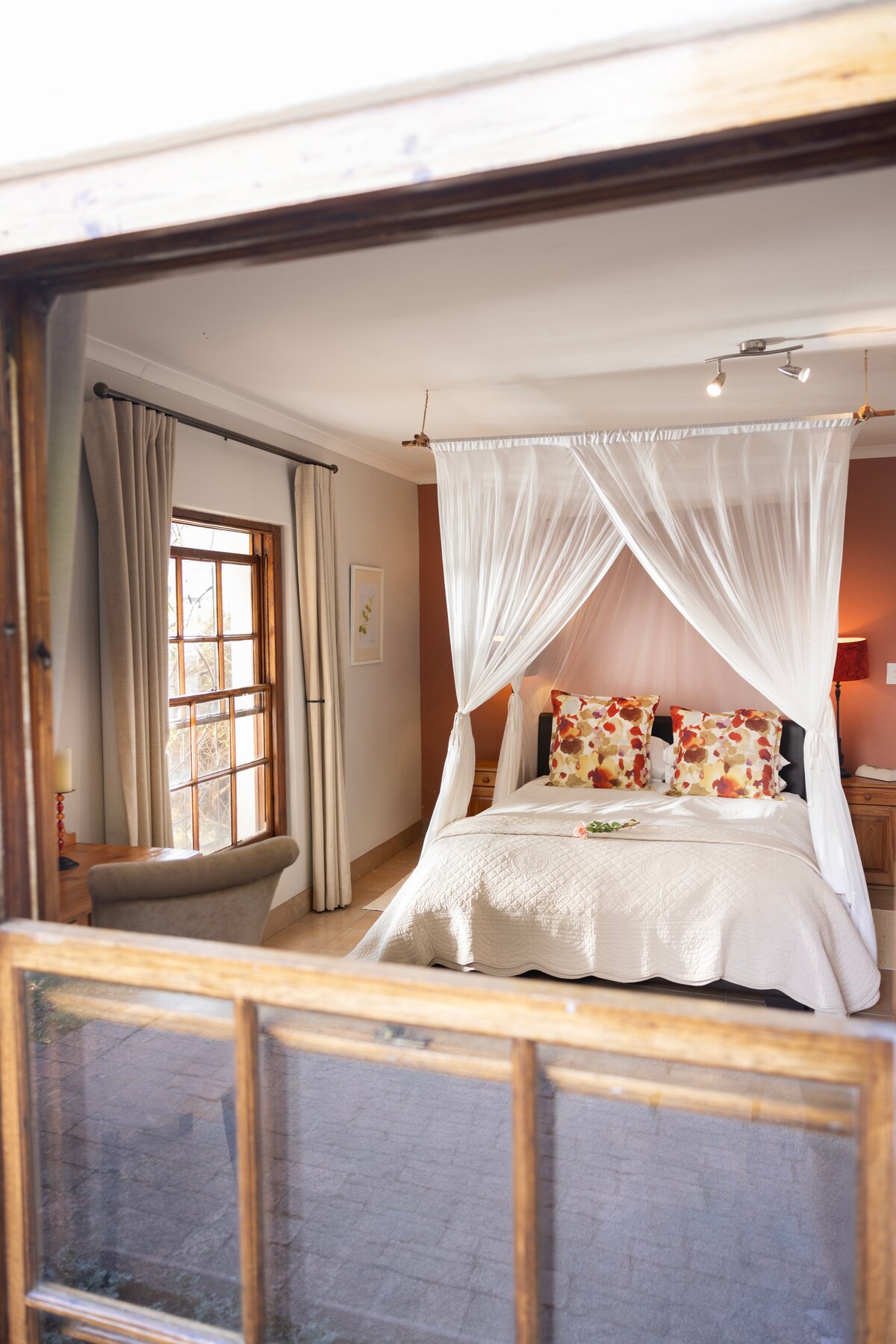 A cottage room overlooking the herb garden. Colours of African clay and classic pine decorate this room. En-suite bathroom with overhead shower and marble tops. Patio area. Under-floor heating in bedroom