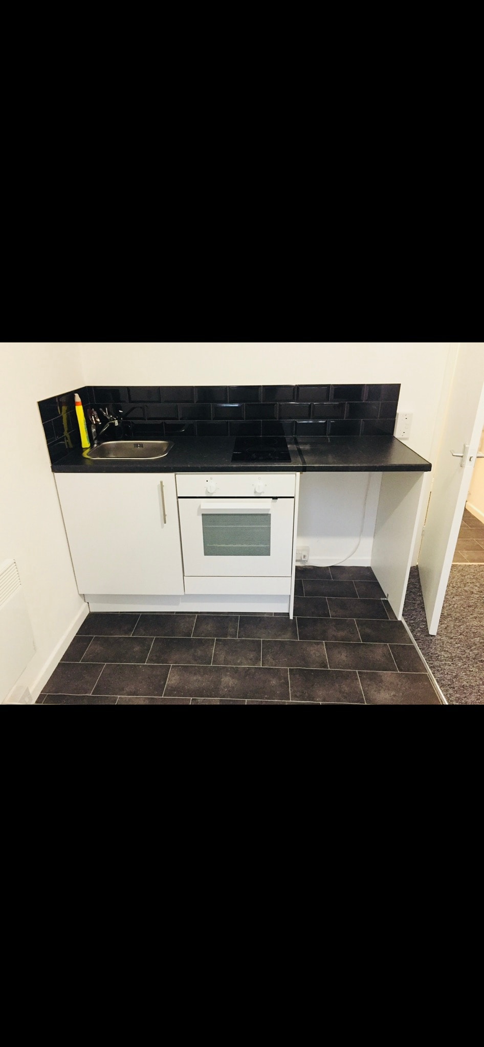 The kitchen has an electric hob, fridge, a sink, a kettle and a microwave.