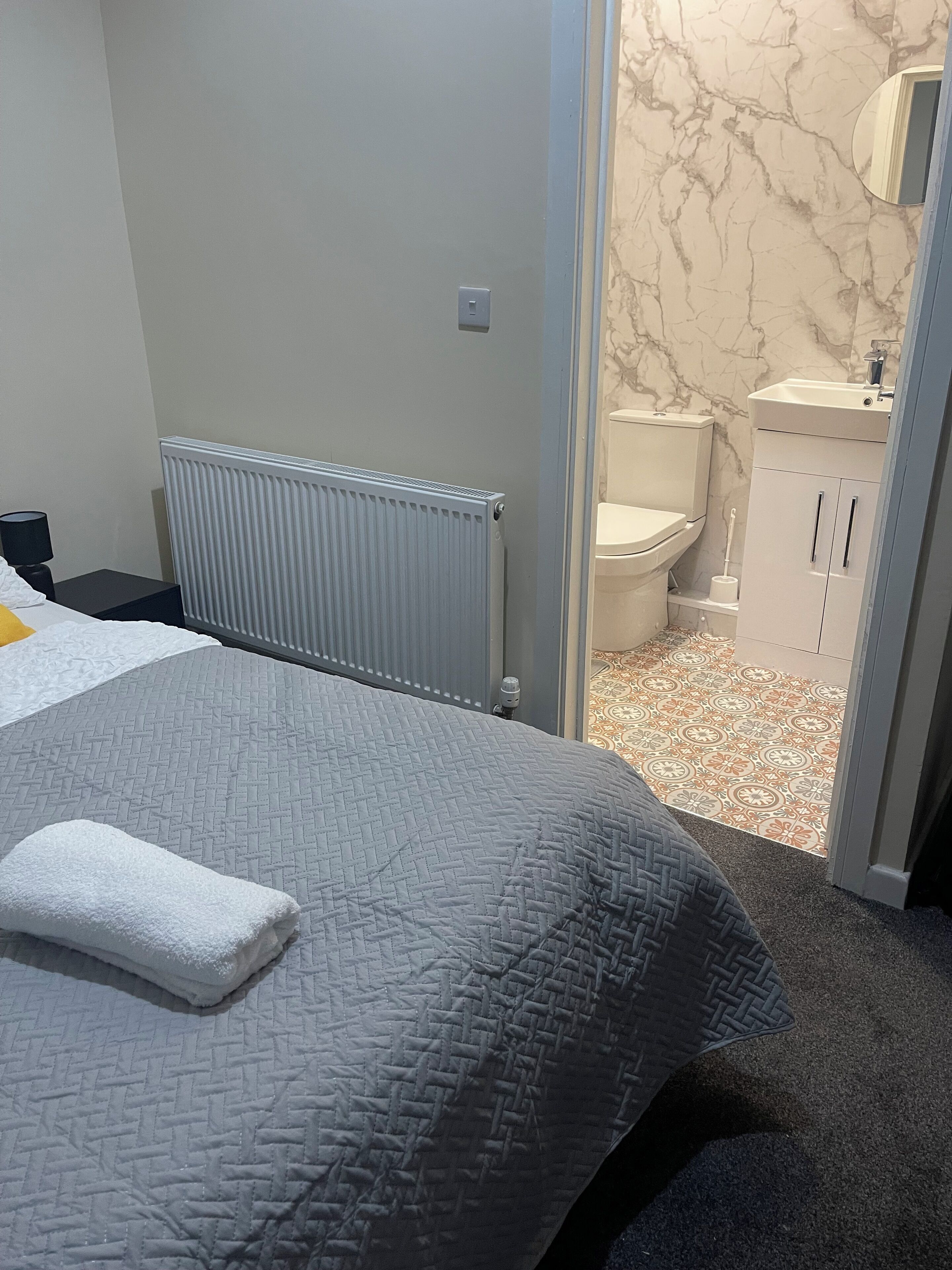 This large welcoming family room features a super king size bed with additional double sofa bed . Brand new modern en-suite bathroom and large wardrobe with a dressing room . Ironing board /iron, hairdryer and tea / coffee facilities provided as well as your own fridge .