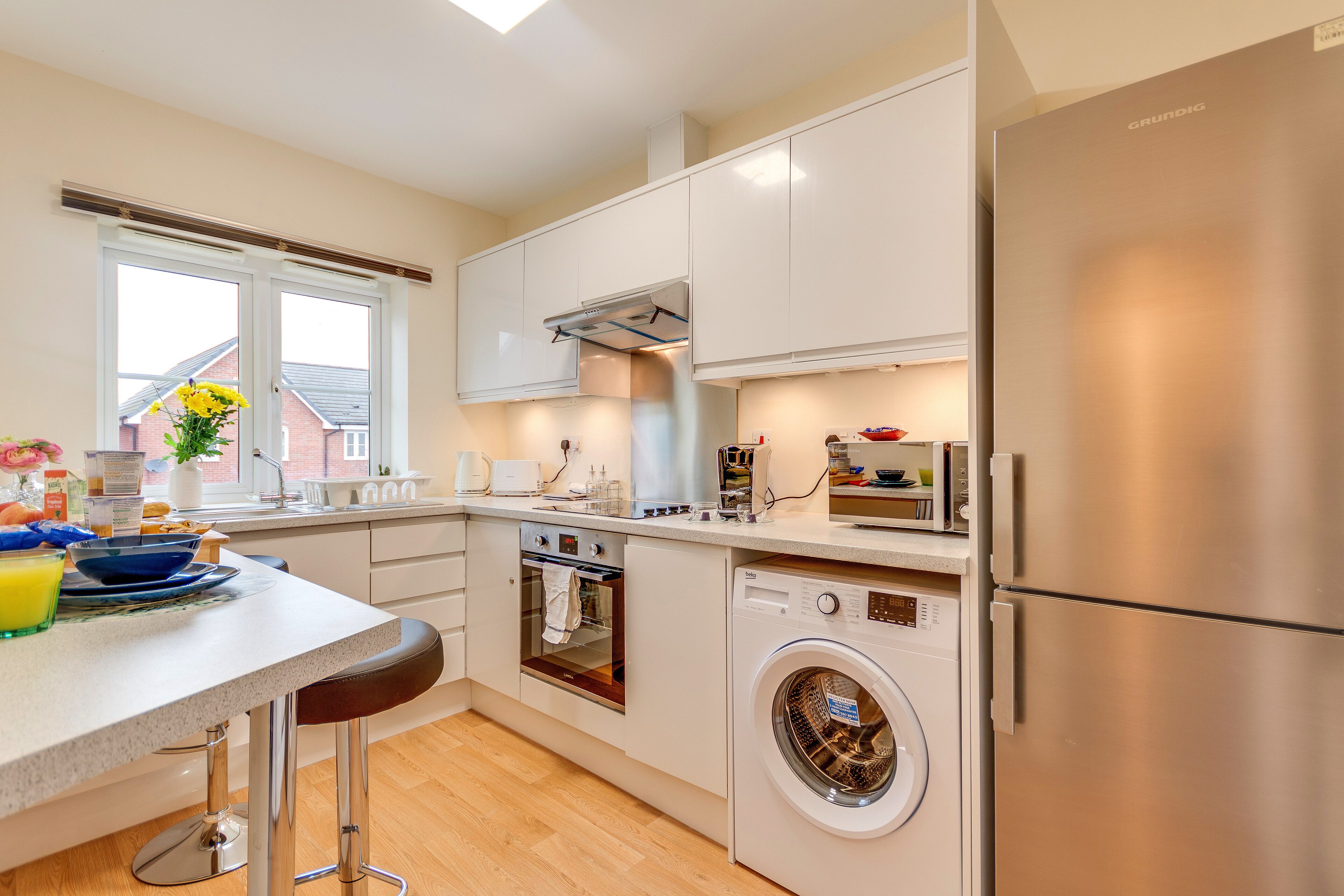 Kitchen amenities: double oven, fridge freezer, dishwasher, fully stocked with pots, pans, plates, cutlery.