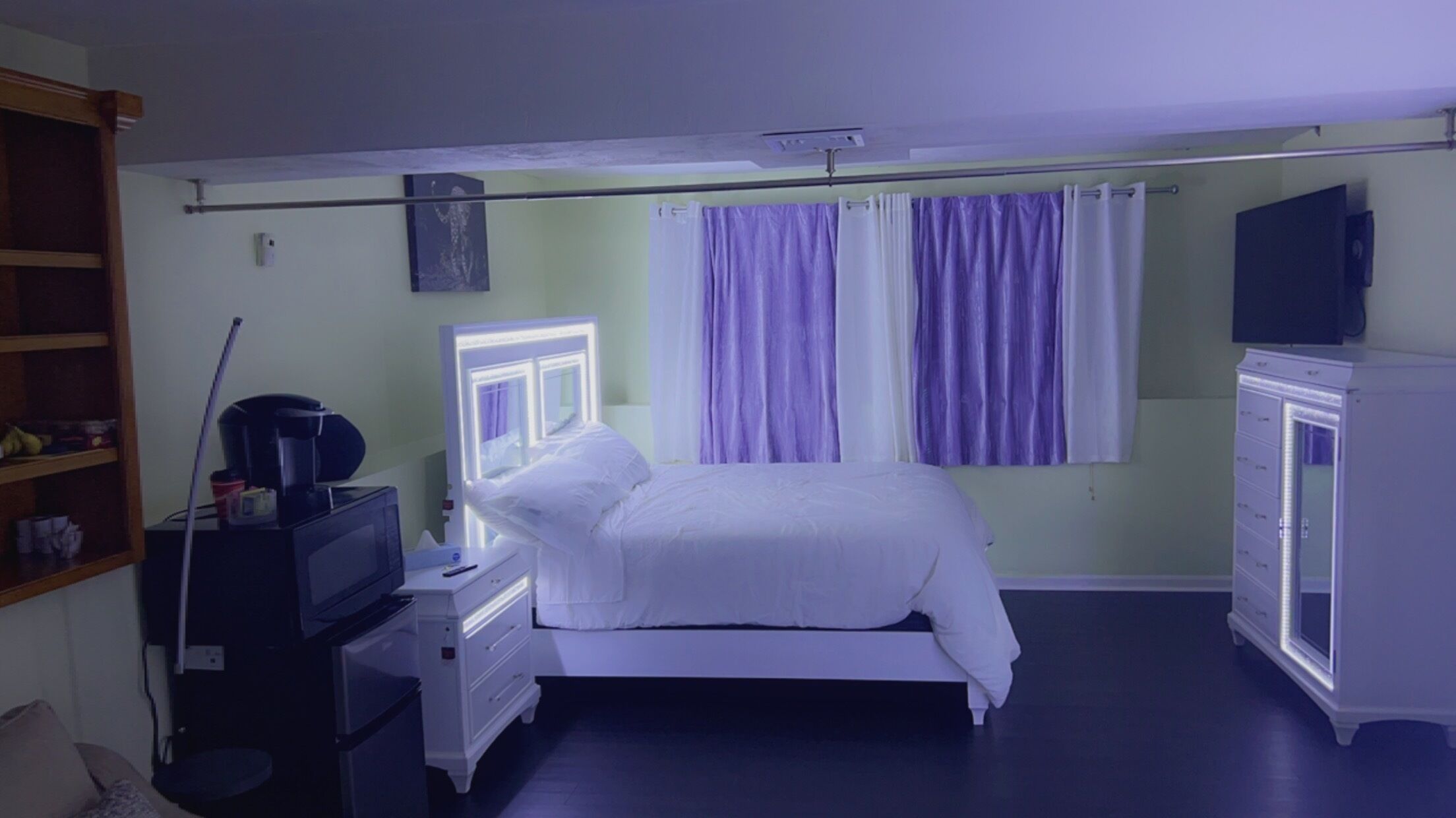 Enjoy a large room with two queen beds, a private room with a fancy king bed and pull out bed. Enjoy a good sized room with a full bed.