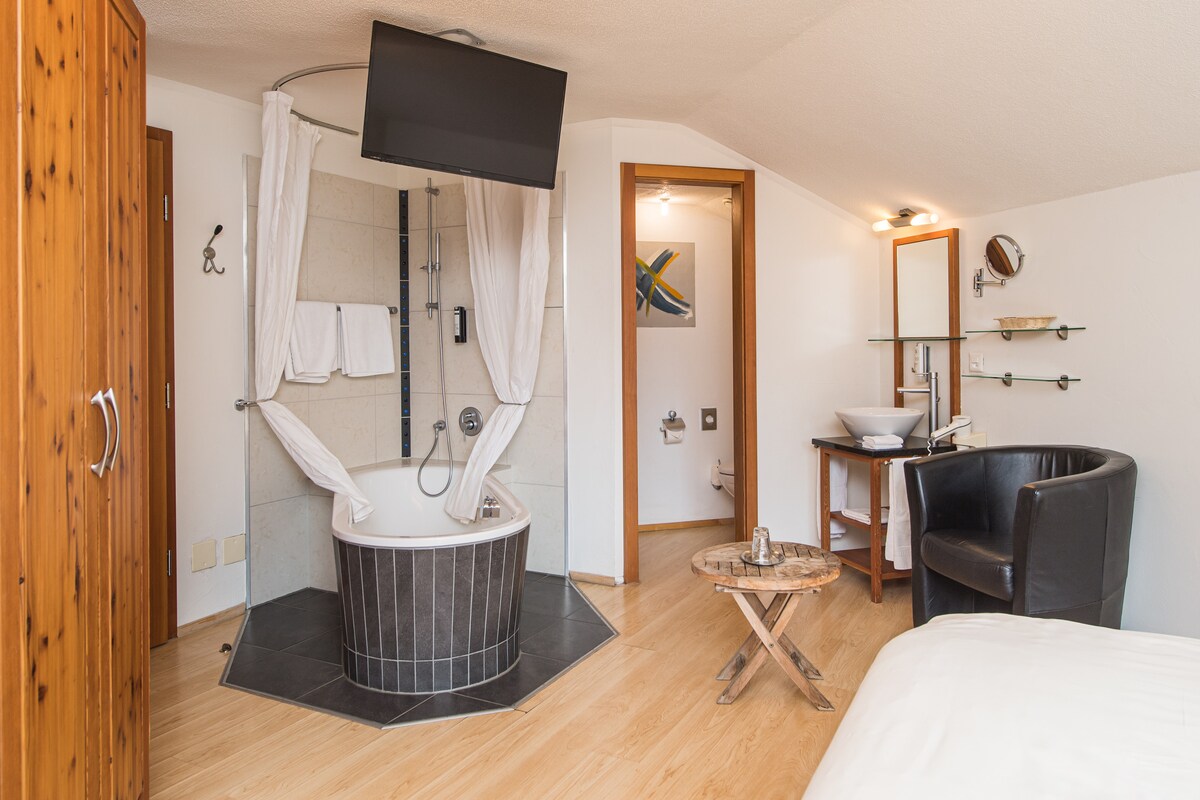 The open bathroom is equipped with a spacious shower, sink and separate toilet and offers everything you need for a relaxing time.