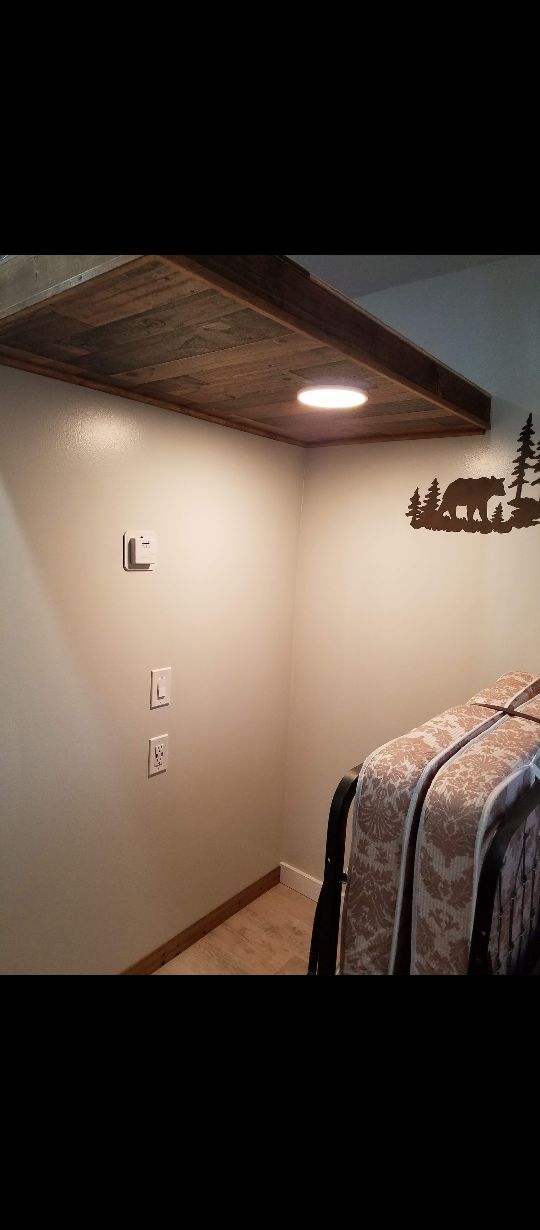 The cabin has lots of beautiful wood accents, natural light and room darkening shades.