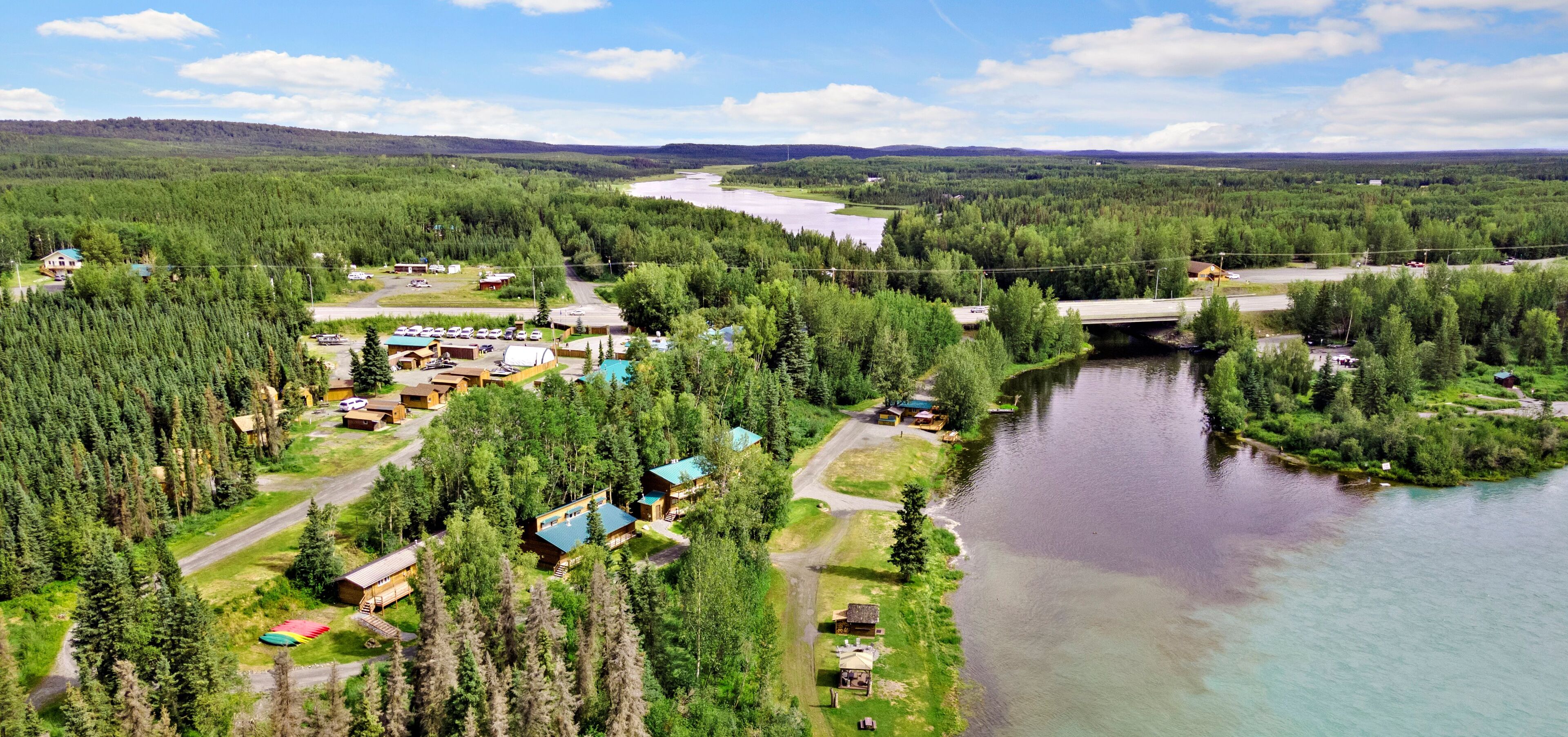 5 uniquely decorated cabins serve as your base for all your Alaska fun! Each cabin is 500 sq feet and has a small kitchen, bath with tile shower, one bedroom and a sleeping loft. Kenai river access for fishing a short walk from your cabin. 13 acres allows for the chance see wildlife from your porch while having coffee from the Keurig coffee maker. We also have 6 RV sites with full hookups. Dry camping. Laundry cabin with coin op washers and dryers. It also has an extra bath with 2 Showers.