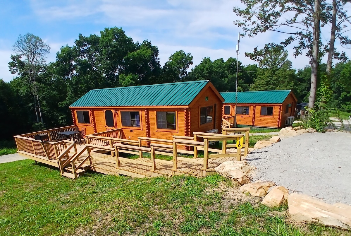 Come enjoy a real log cabin experience in the quiet hills of Hocking Hills/Lake Logan. Inside the beautifully wood furnished cabin you will enjoy a living area with a futon, a full kitchen, and a full bathroom. They feature a private room with a queen bed, private room with a full bed and a futon in the living area for additional guests. Cabin is equipped with one TV which is centrally located in the main living area. Air-conditioning and heat keep the cabin comfortable in all seasons. Your outdoor living space includes a deck, including seating. Every cabin has its own charcoal grill, and fire pit. A parking pad is provided for the cabin. All campground amenities are available with registration. Young children are free, so please do not include children 2 and under in your reservation count.