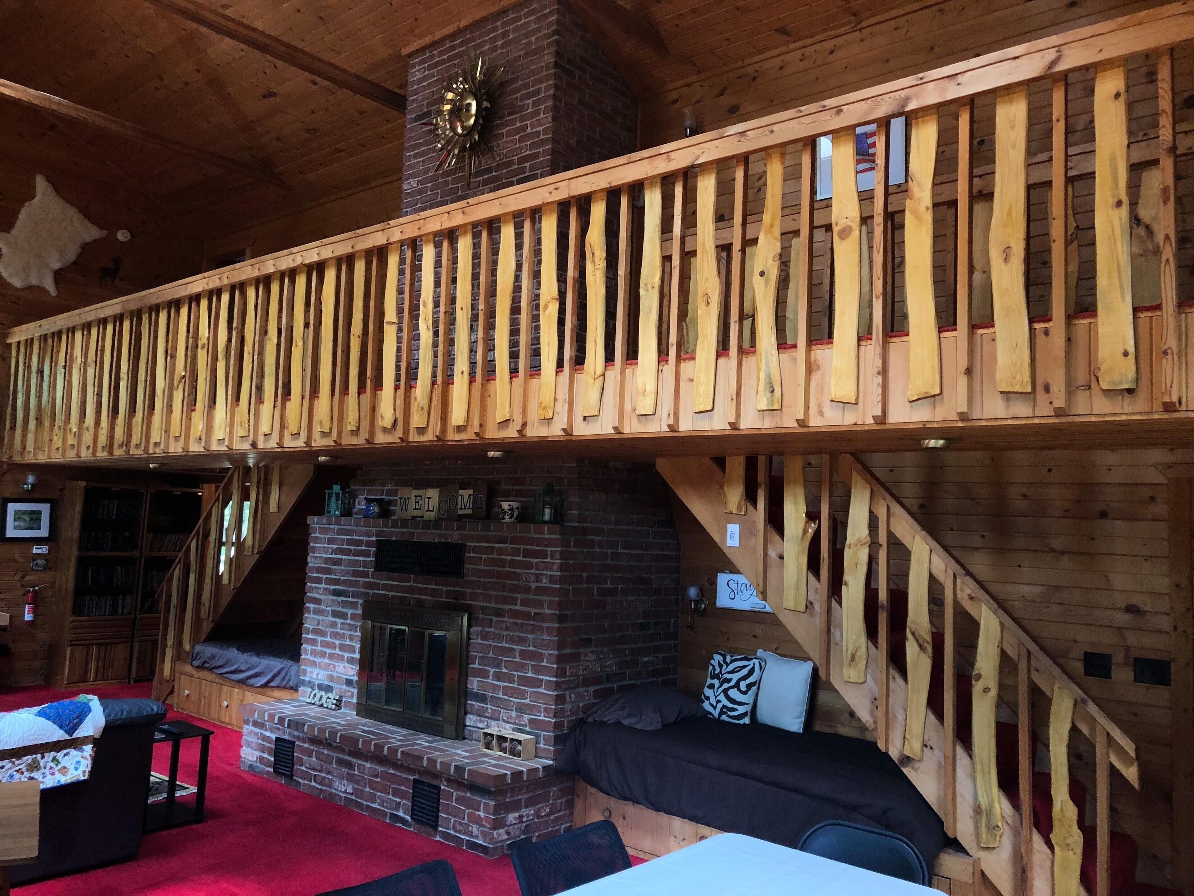 To make sure your visit is as enjoyable as possible, the lodge is completely furnished, fully stocked, and also has WiFi. We take great pride in keeping our place very clean and comfortable. When you walk in, you’ll love the pine interior and soaring vaulted ceilings. Want to pack light? No problem, there is also a washer and dryer on sight. There are 2 well appointed bedrooms on the main level, each with a comfortable queen bed. Upstairs, the loft is very spacious and has another comfortable queen bed and 2 comfy twin beds. The living room flat screen has Direct TV for your enjoyment. There is one very clean and spacious bathroom and also a dedicated laundry room. Outside there is a huge covered porch to relax on and also a 20 by 20 pole barn available for use (just ask us when you book). Charcoal grill and fire pit for family fun.