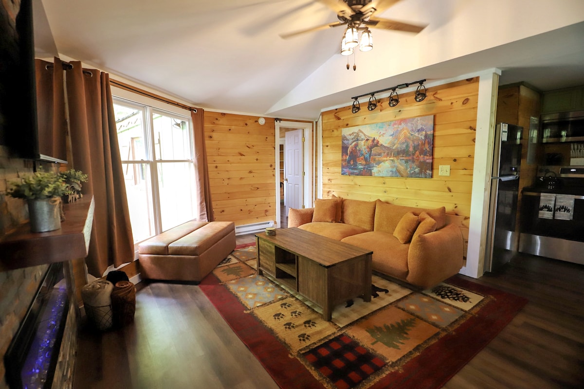 Like many mountain cabins, we don’t have air conditioning—but our large windows let in gentle mountain breezes and plenty of sunshine, creating a fresh, airy feel. When the windows are open, enjoy a lovely cross breeze that keeps things cool and comfortable. Plus, we have a ceiling fan in the living room and rotating fans in each bedroom to keep you cozy all year round.