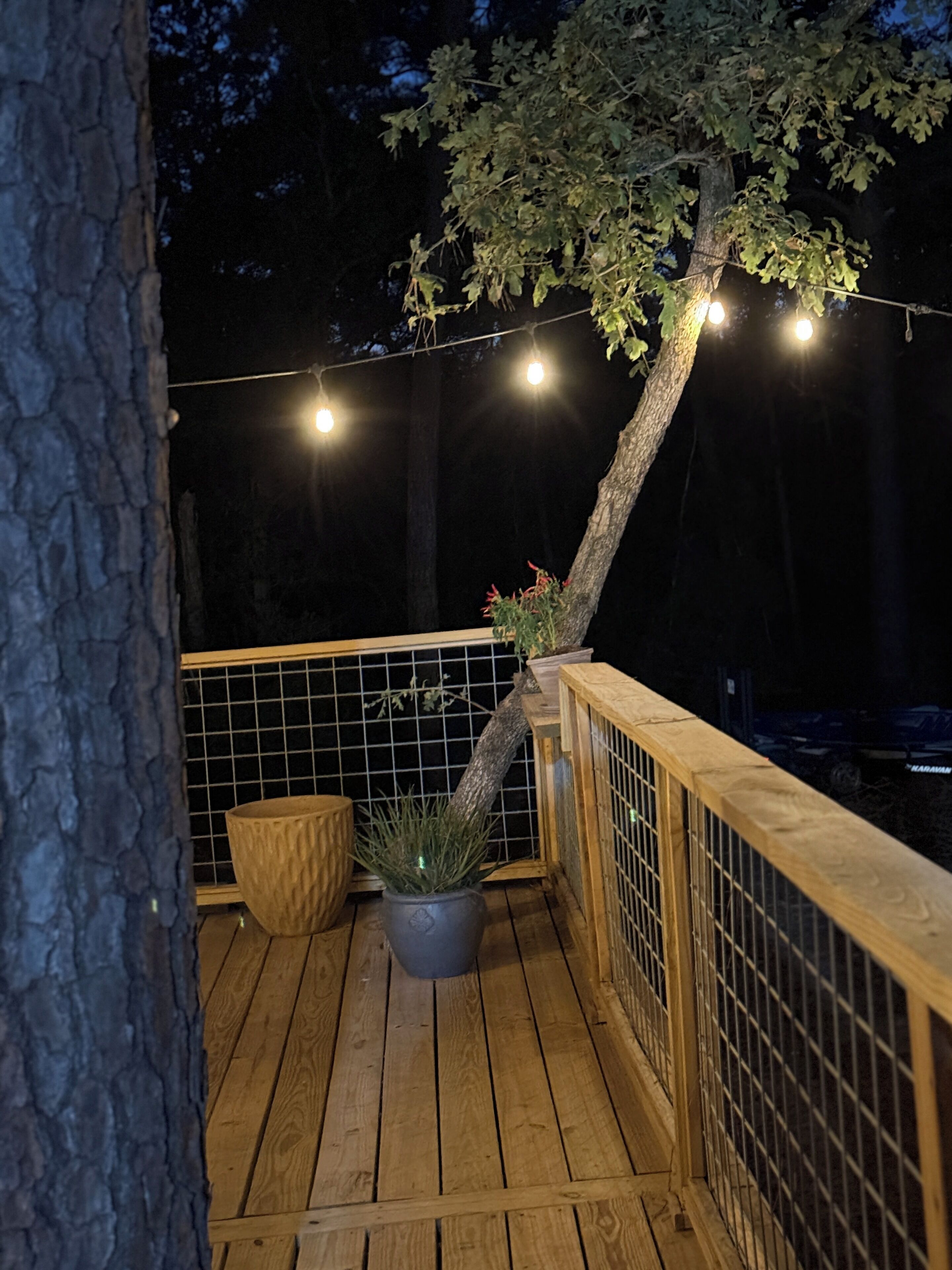 Beautiful Log Treehouse: We bought this cabin in the summer of 2009 and feel so fortunate to be able to share it with guests and friends and family. All three of our kids (now grown) love coming here to kayak, fish, golf, bird watch, relax and explore with their families. Our cabin is nestled high up in Pecan, Sycamore, Mimosa and Redbud trees. The view from the upper deck is fantastic. Great for bird watching. We hear the owls at night and watch red tailed hawks make nests and raise their babies. We have left the chicken coop standing as some day we hope to retire here and raise a small flock. You can't beat this for a perfect vacation spot whether you're wanting adventure or relaxation.