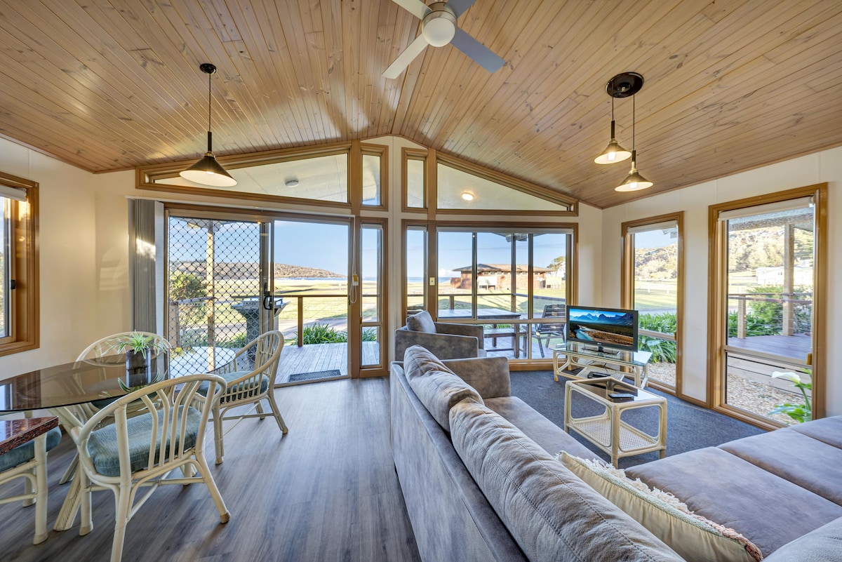 Stay close to the beach, with some cabins even offering a view. Our 2 Bedroom Standard Cabins sleep up to five guests (maximum 3 adults), with a queen bed in the main bedroom and either a bunk and single bed, or a double with single bunk above in the second bedroom. Also features a bathroom with either a shower over spa or walk-in shower, kitchen, living area, and private deck with BBQ. Please ensure you advise your bedding preferences at the time of booking.
